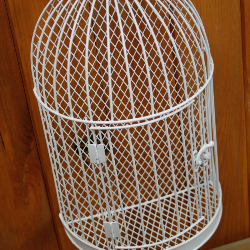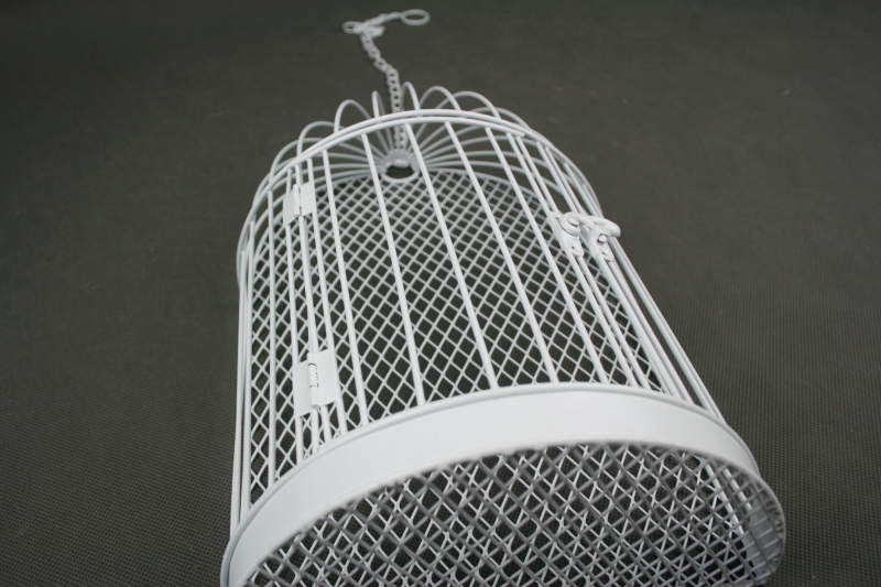 Klietka na ptáka má kovovú šnúru pre zavesenie na stenu. Má netypický polguľatý tvar.