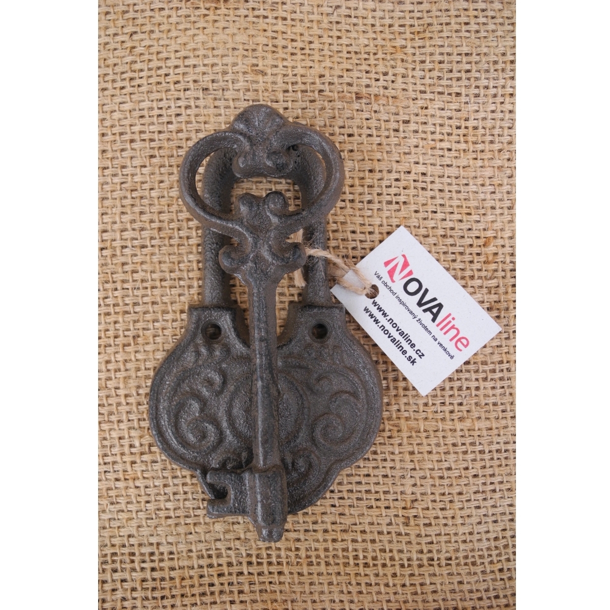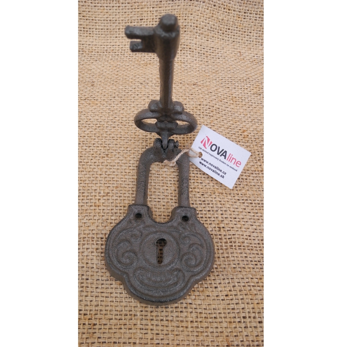Klopadlo na dvere v podobe visiaceho zámku s kľúčom bude štýlovou ozdobou na starých vrátach vidieckej chalupy.