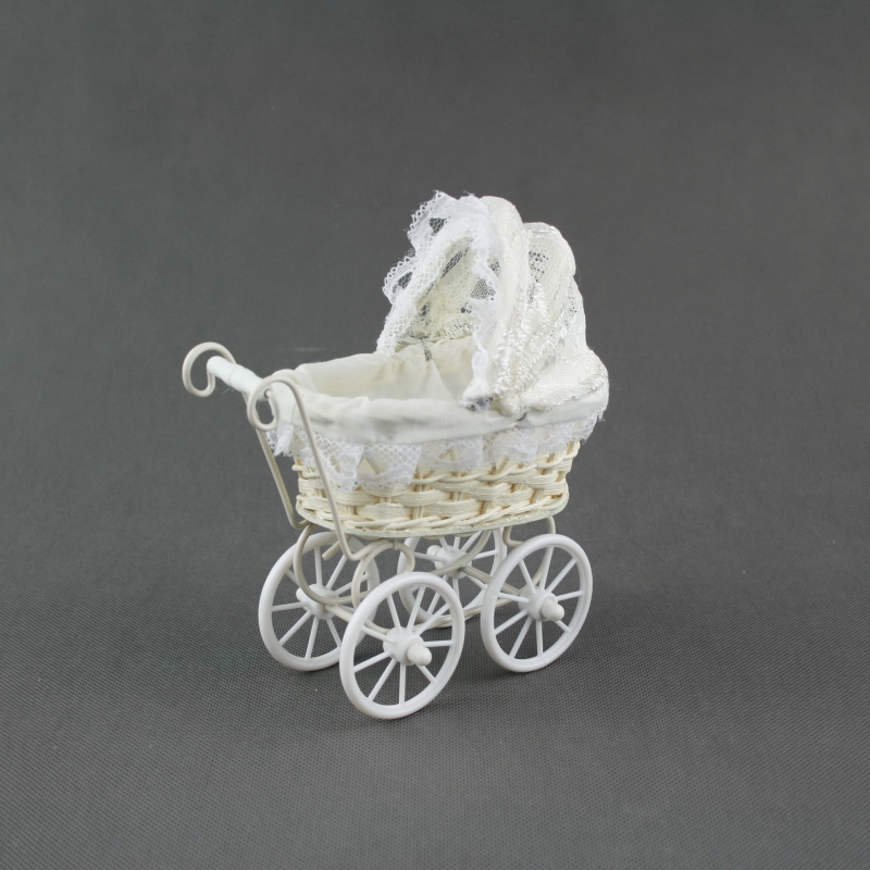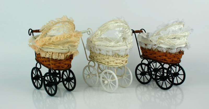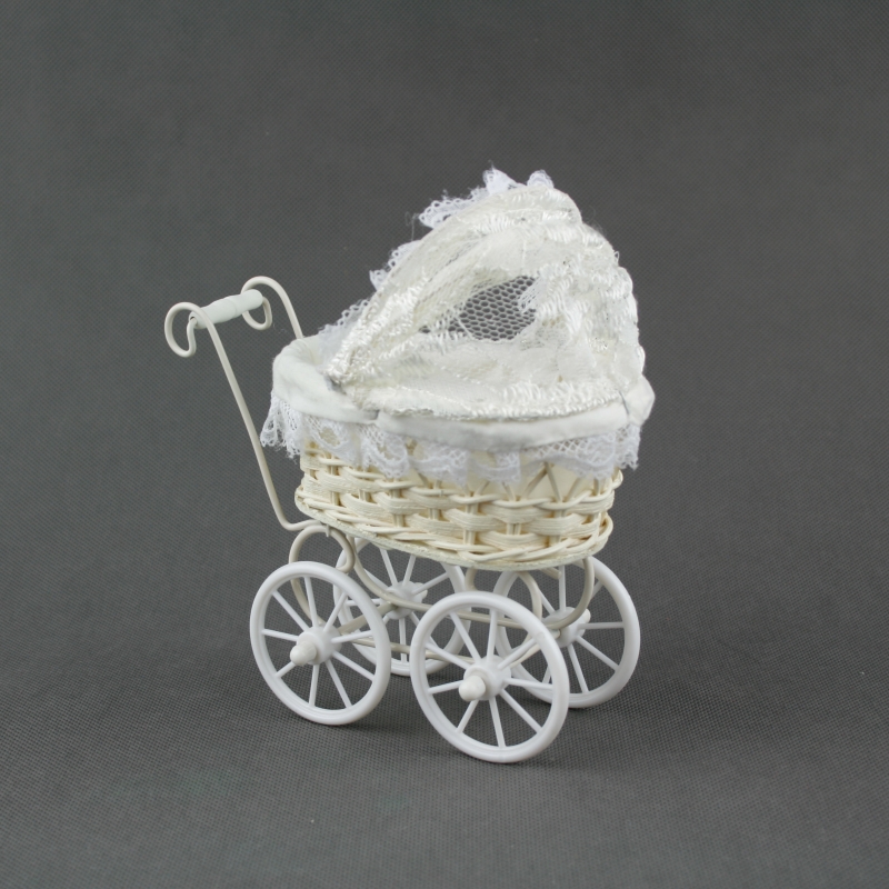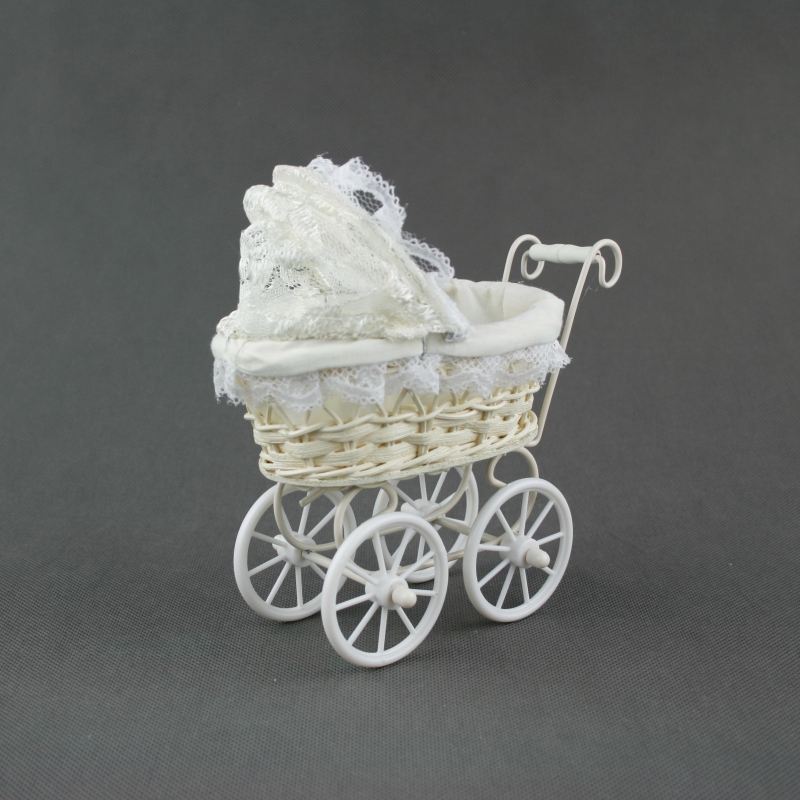 Kočík dekoračný strong> s prúteným košíkom a striešku. Držiatko kočíka je vysústružený z dreva. Rám spodnej časti kočíka je vyrobený z kovu a plastových koliesok.