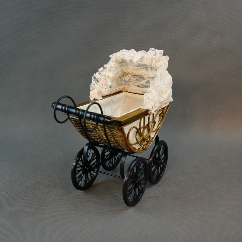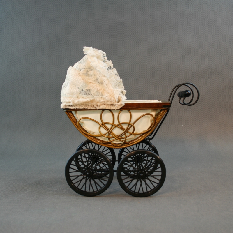 Materiál: látka, čipka, kov (rám kočíka), plast (kolieska), prútia.