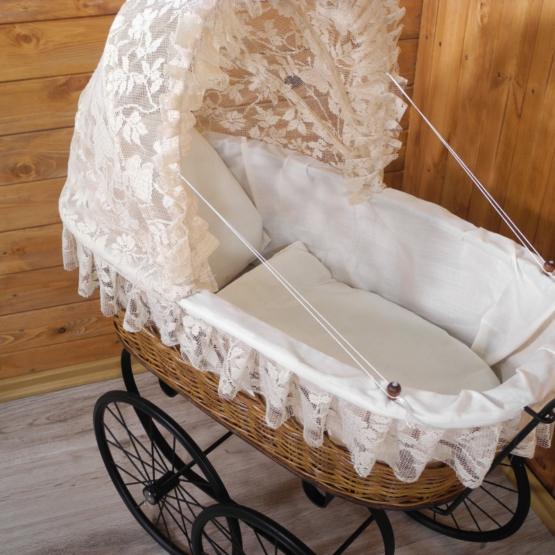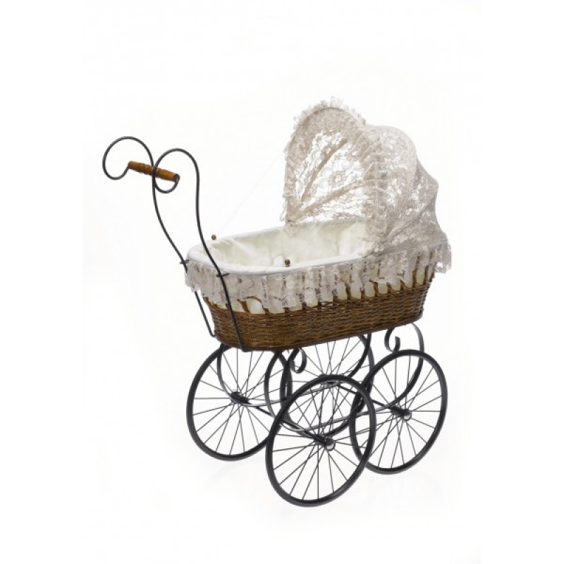 Kočík s rozmerom 90 x 36 x 90 cm predstavuje nádhernú dekoráciu, ktorá vám bude prinášať radosť a dobrú náladu, kedykoľvek sa naň zahľadíte. Kočík má prútená košiny v prírodných tónoch. Bohato ju však prekrýva a zdobí nádherná čipka, z ktorej je zhotovená aj strieška. Kolesá i držadlá sú z čierneho kovu. Verte, že taký kočík zatúži mať doma každá žena!