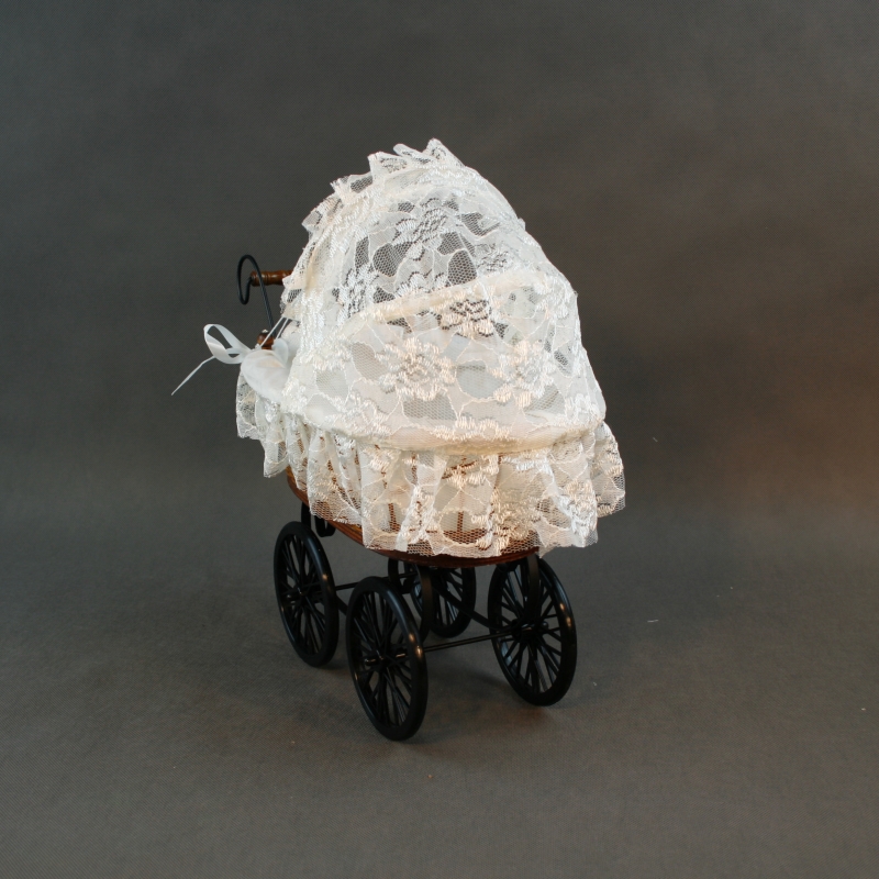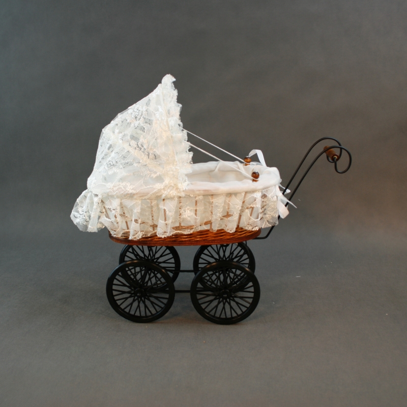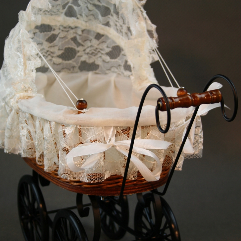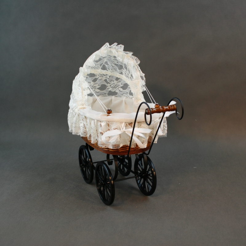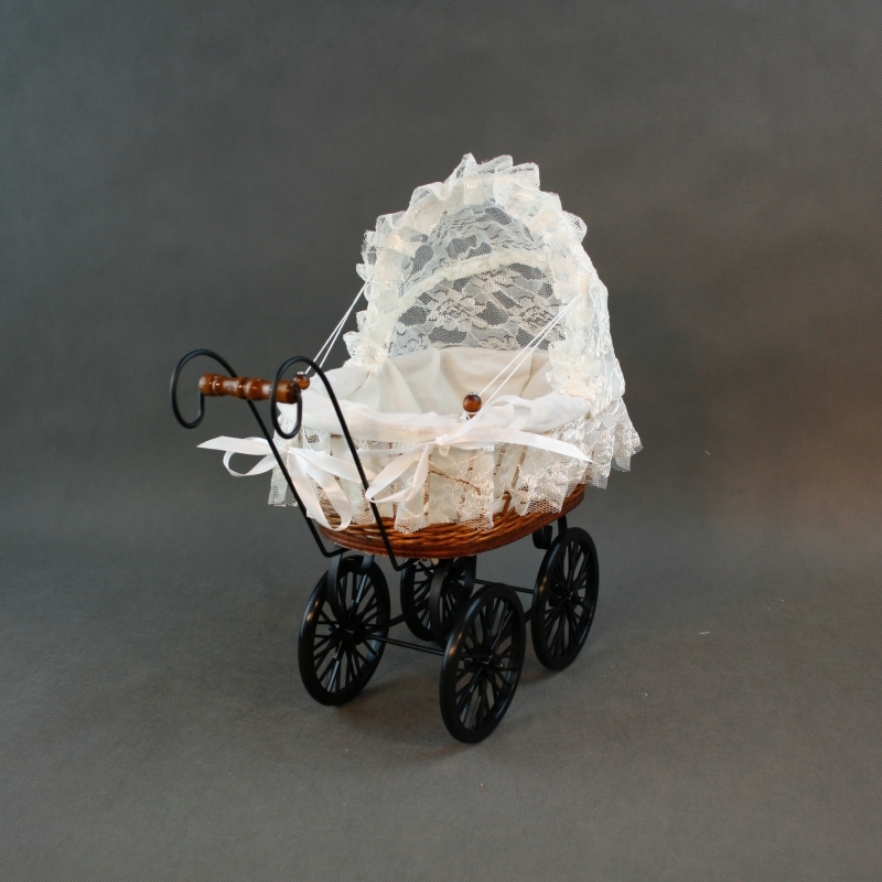 Materiál: látka, čipka, kov (rám kočíka), plast (kolieska), prútia.