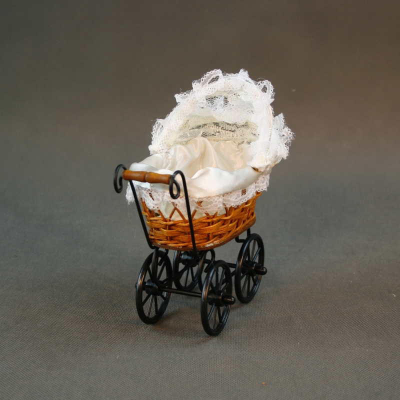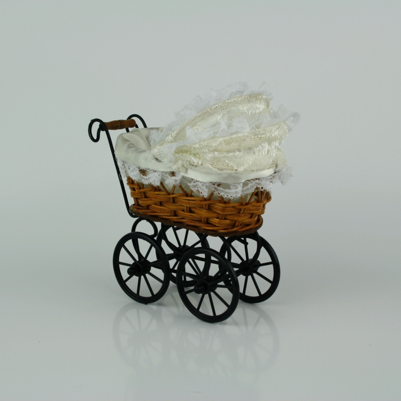Kočík prútený strong> s prúteným košíkom a striešku. Držiatko kočíka je vysústružený z dreva. Rám spodnej časti kočíka je vyrobený z kovu a plastových koliesok.