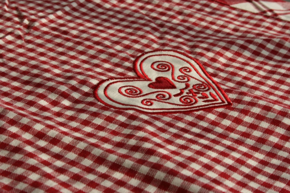 Kockovaný obrus behúň so srdcom 140x45cm.
