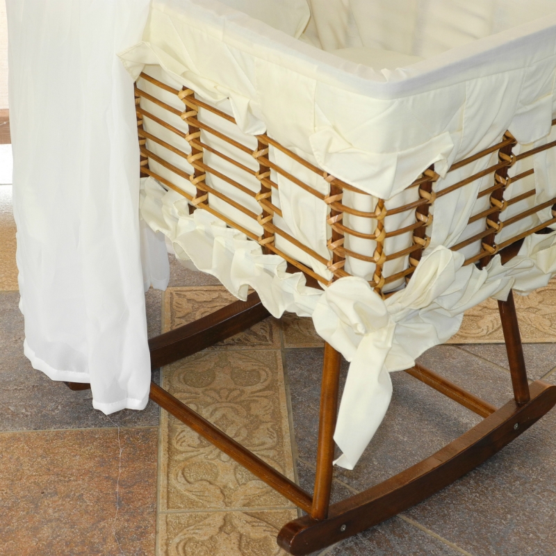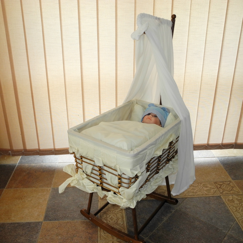Součástí kolébky jsou nebesa s konstrukcí, bavlněná výstelka kolébky a sada polštáře a peřinky.