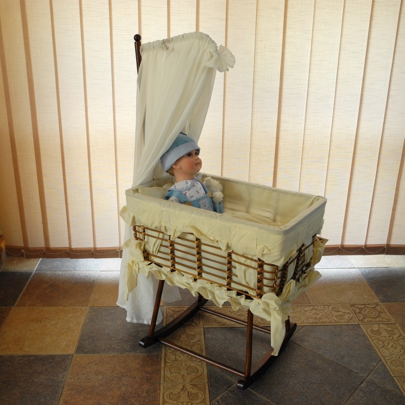 Kolébka pro panenky dřevěná o rozměrech 60cm délka, 36cm šířka a výška včetně nebes 103cm.