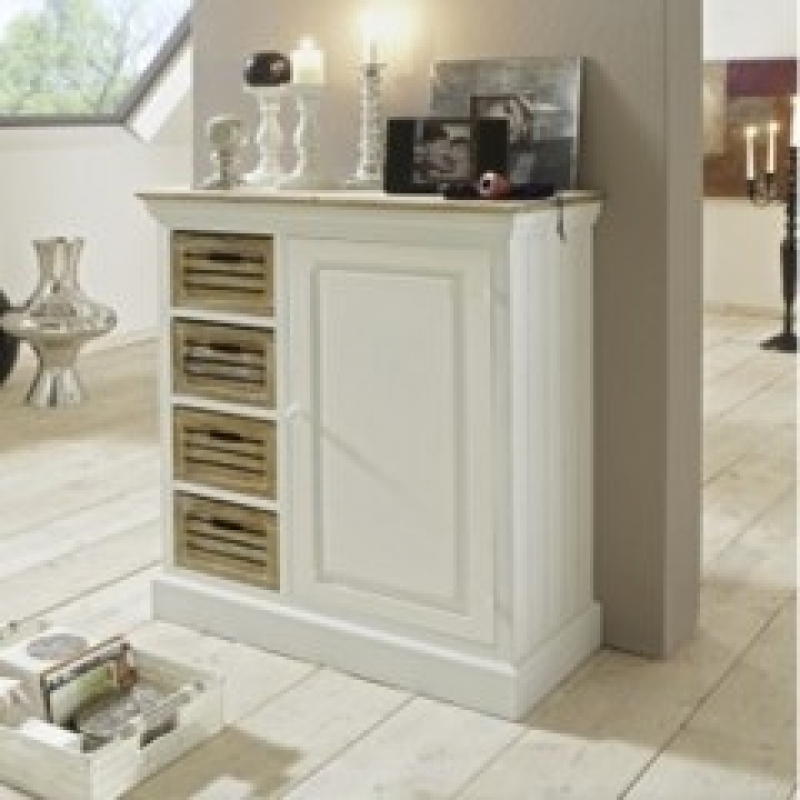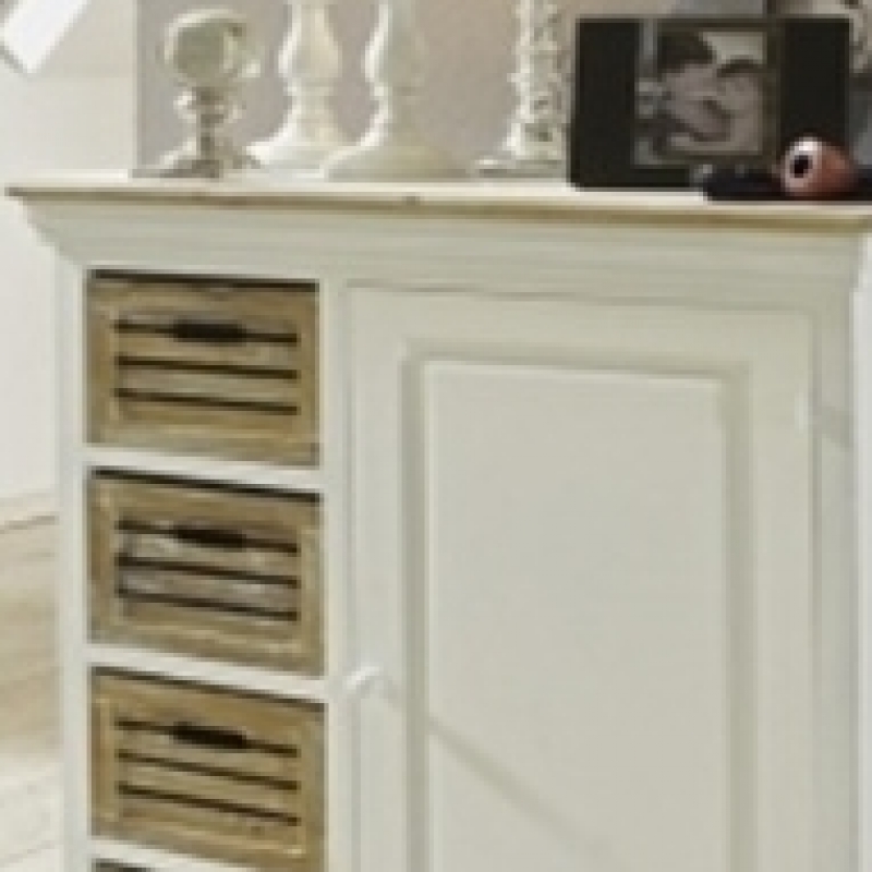 rozdelená na dve nerovnaké časti - menšie diel zaberajú štyri praktické šuplíky vo farbe dreva. Väčšia časť je krytá bielymi dvierkami.