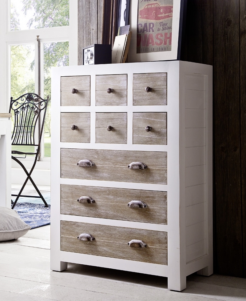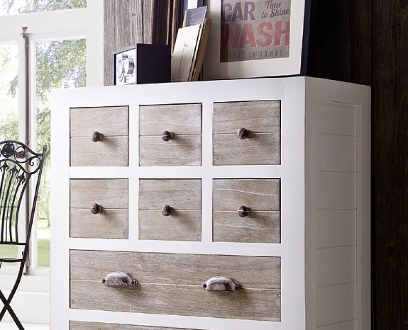 Biela komoda môže byť súčasťou obývacej izby, jedálenského kúta (ako príborník) alebo spálne. Komoda má tri veľké šuplíky v spodnej časti a 6 menších v hornej. Šuplíky sú v prírodnej farbe dreva, ktoré sú v kontraste s bielou konštrukciou komody. Majú rôzne úchytky, ktoré spolu ale ladia a vytvárajú jedinečný kus nábytku.