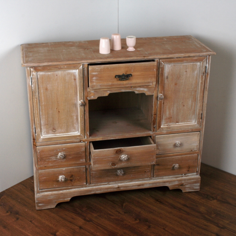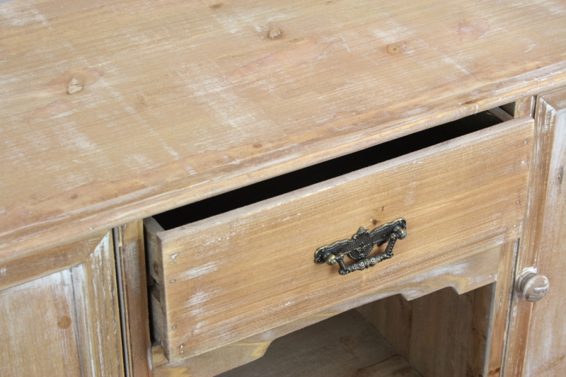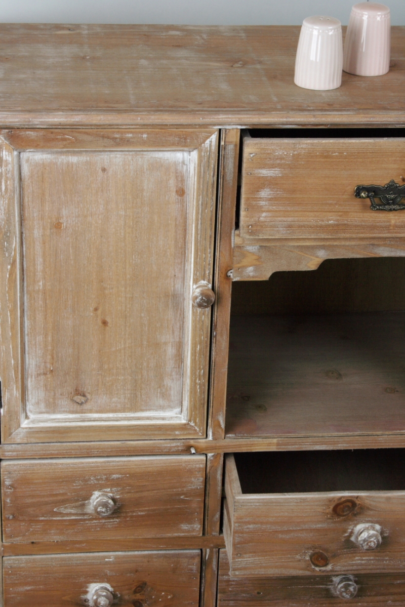 Komoda má v spodnej časti šesť šuplíkov s klasickými guľatými úchytkami, dve skrinky, otvorenú policu a ďalšie šuplík s kovovým ozdobným úchytom.