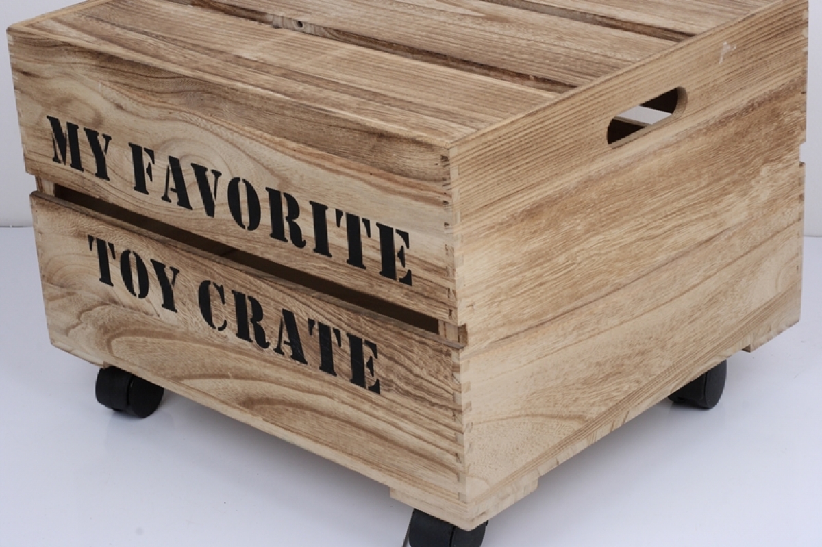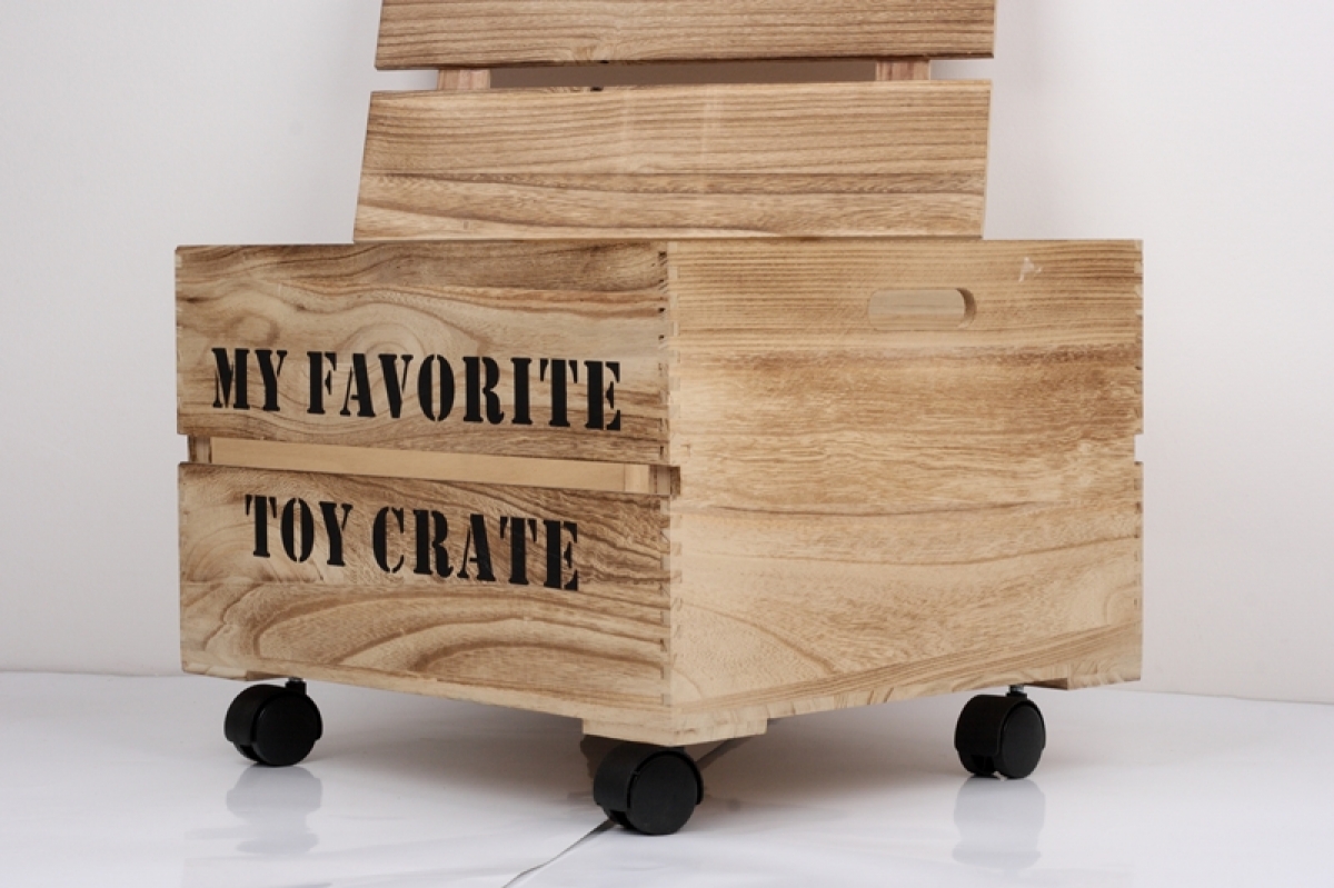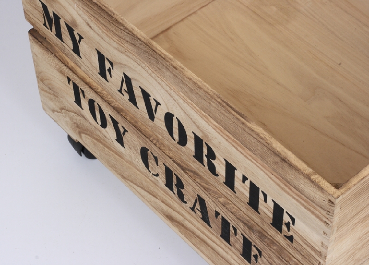 Jednoduchý surový vzhľad je doplnený o čierne detaily v podobe nápisu a koliesok. Veko debny možné odňať a využiť tak stolík aj ako úložný priestor na knihy a časopisy.