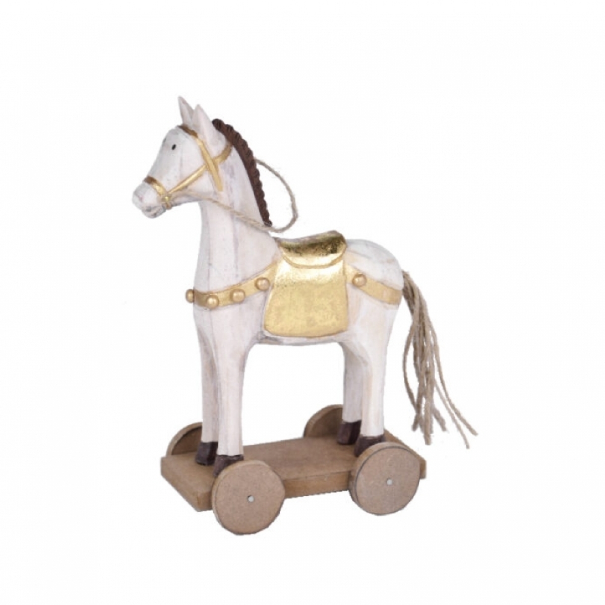 Koník na kolieskach so sedlom a postrojom v zlatej farbe je krásna drevená dekorácia, ktorá ozdobí napríklad poličku v detskej izbičke.