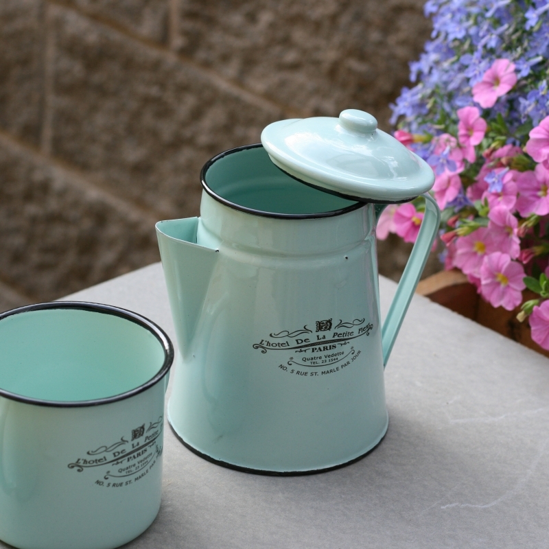 Kolekcia tyrkysového smaltu má čierne okraje a čierne nápisy na prednej strane. Kolekcia obsahuje dva hrnčeky, kanvičku, podnos, umývadlá, mydelničku kýblik, nočník a misky.