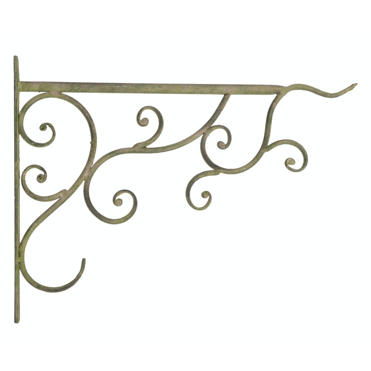 Konzola na stenu so zelenou patinou je vhodná na zavesenie lucerien alebo závesných kvetináčov s previsnutými kvetmi.
