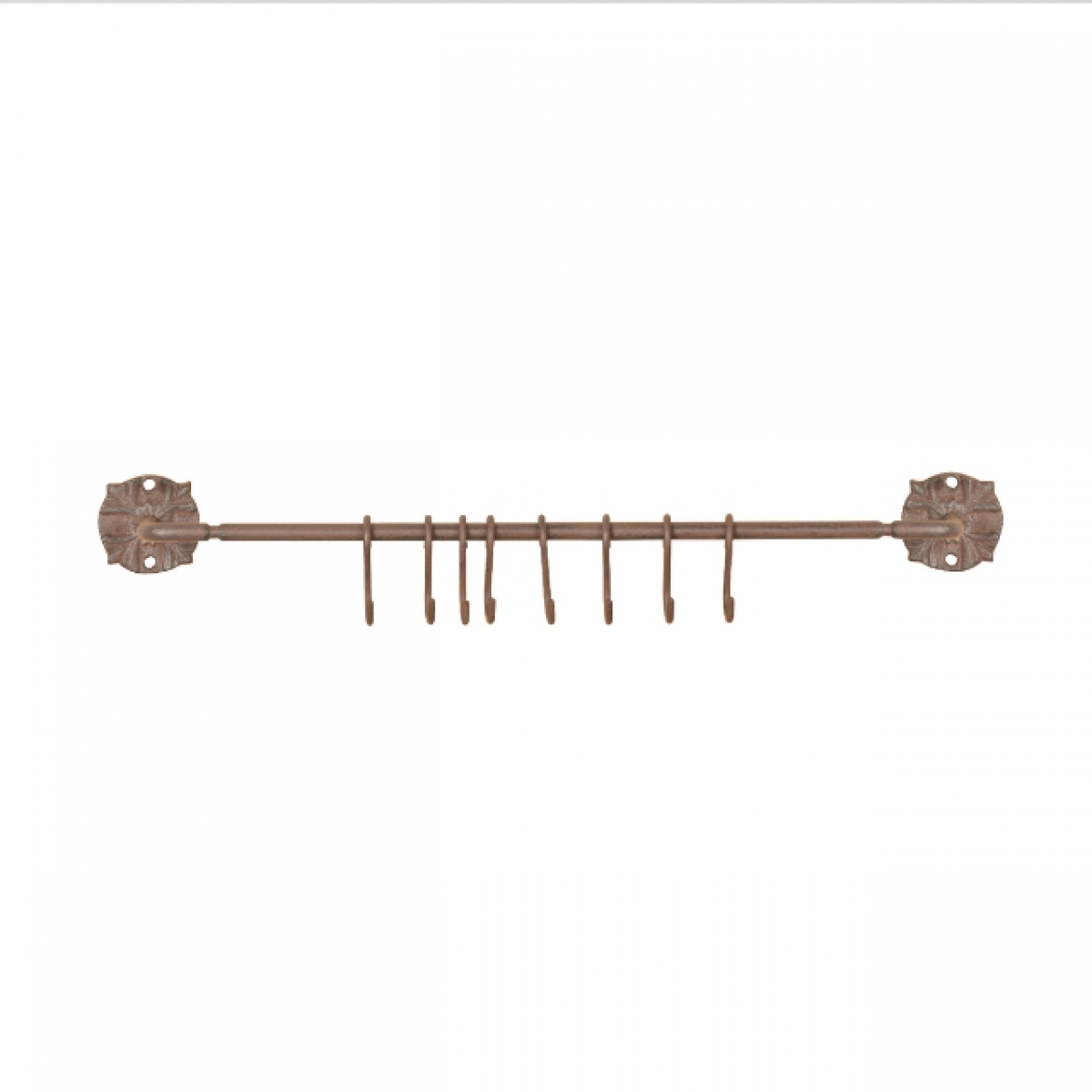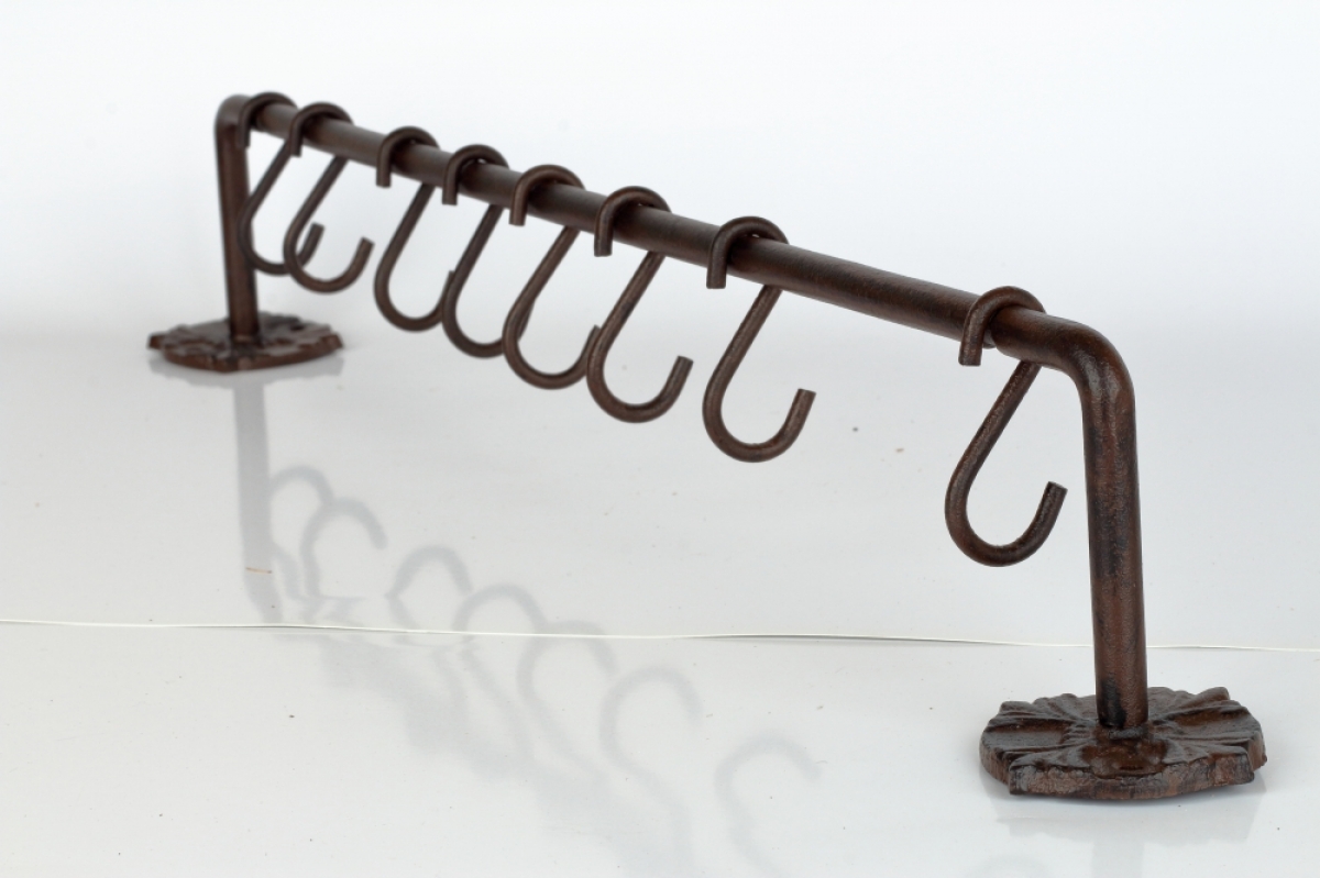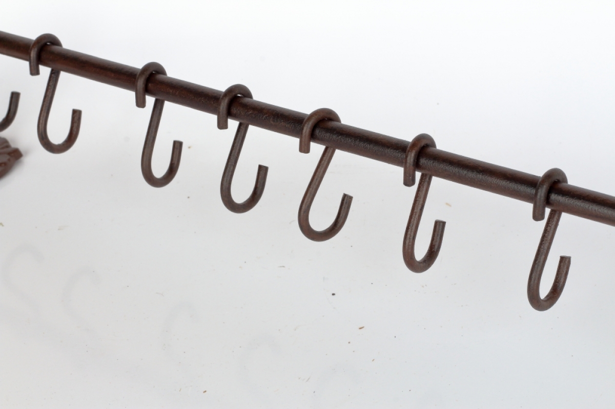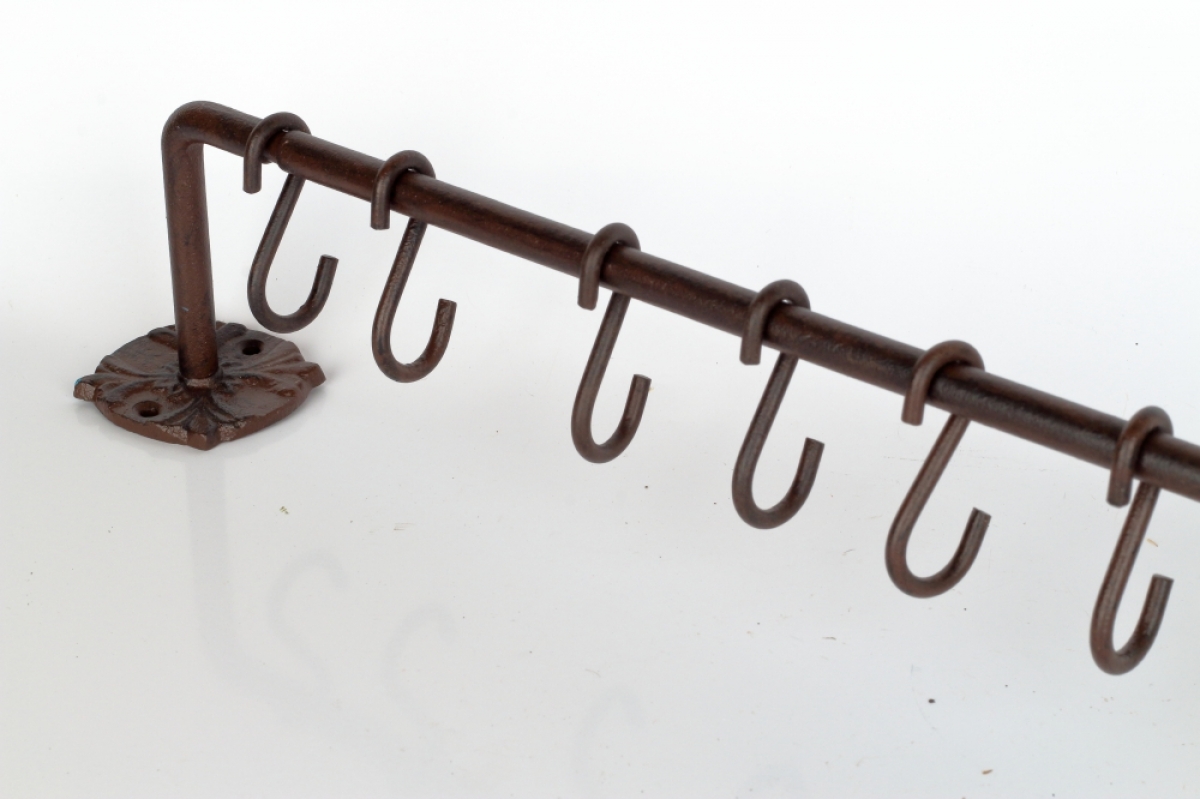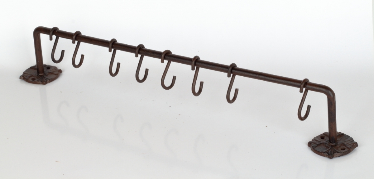 Konzola s 8 háčikmi 57,5x10,0x0,8 cm na zavesenie kuchynskej či záhradného náčinia, hrnčekov alebo ako nástenný vešiak.