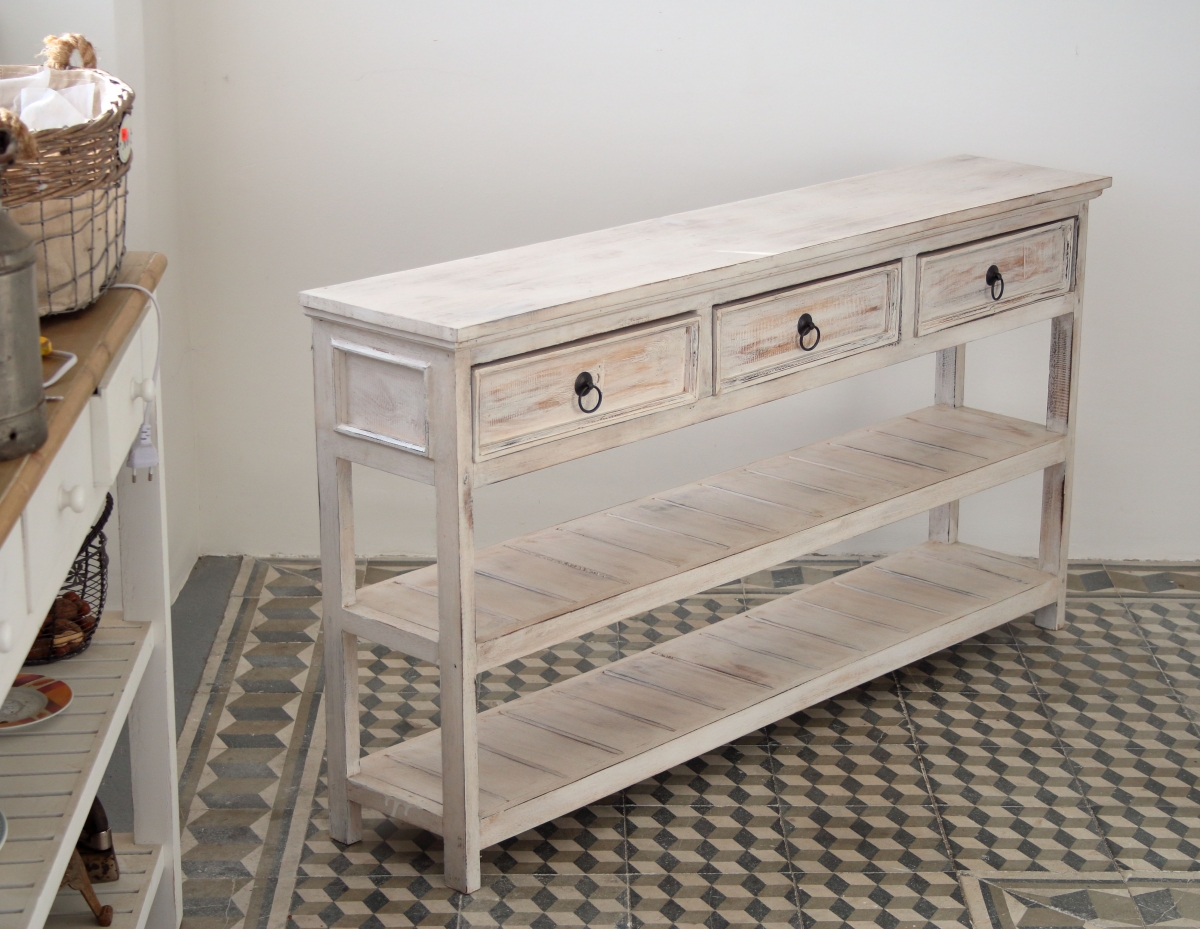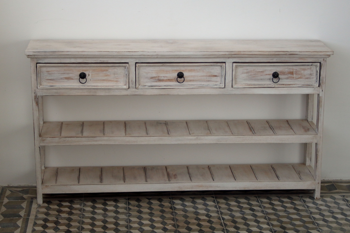 Stolík má dve otvorené police a 3 šuplíky na drobnosti. Ponúkne tak veľa úložného priestoru aj miesto na dekorácie. Drevo s výraznou patinou je pre vidiecky štýl typické, preto v rovnakom dizajne nájdete v ponuke kategórie Nábytok veľa ďalších krásnych kúskov.