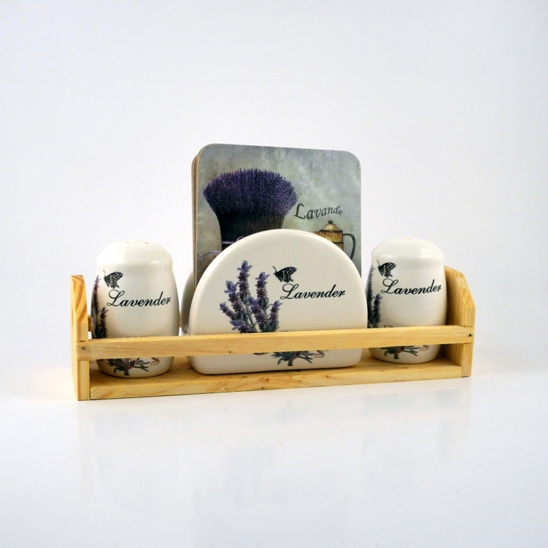 Sada obsahuje keramickou solničku, pepřenku a stojánek na ubrousky na dřevěném podstavci.