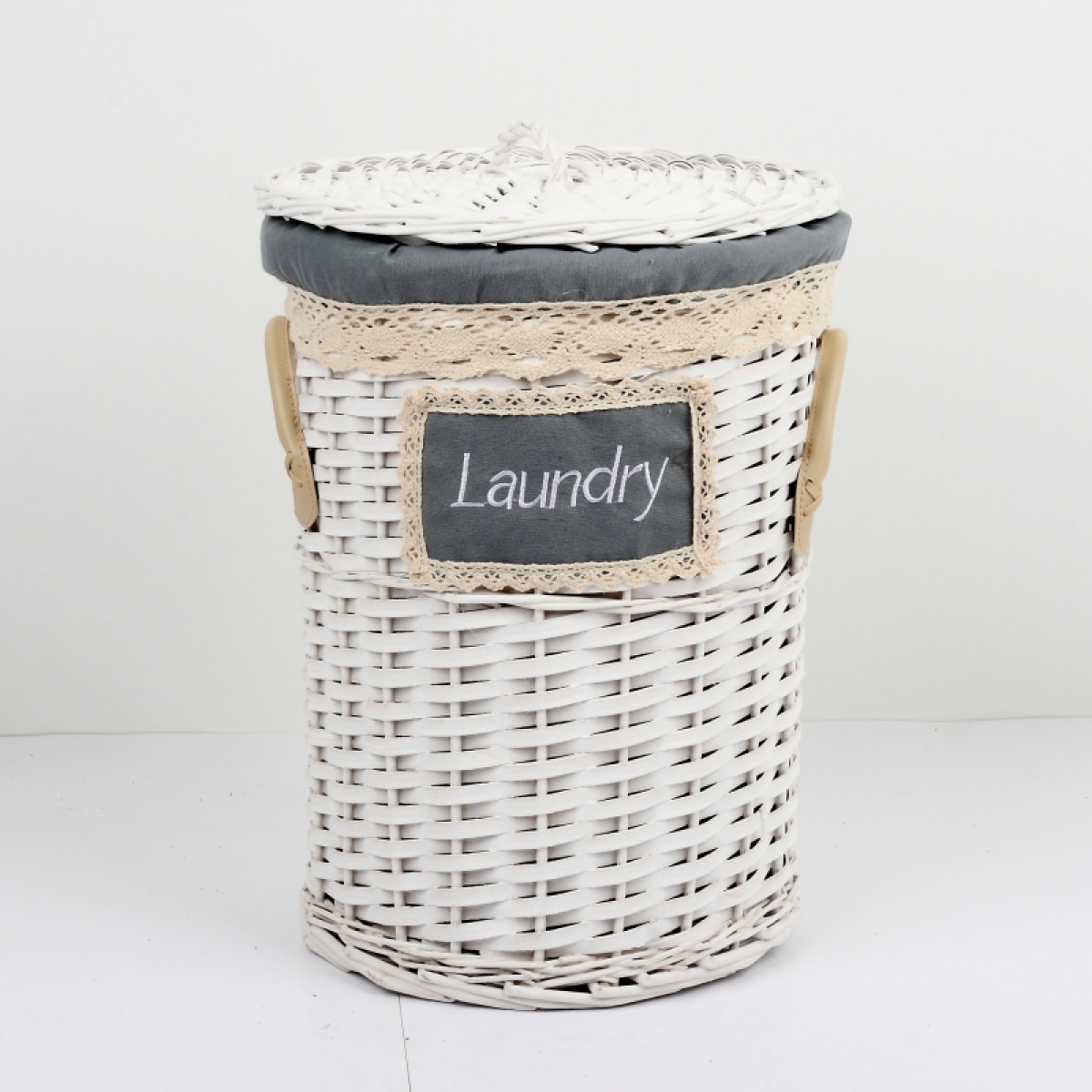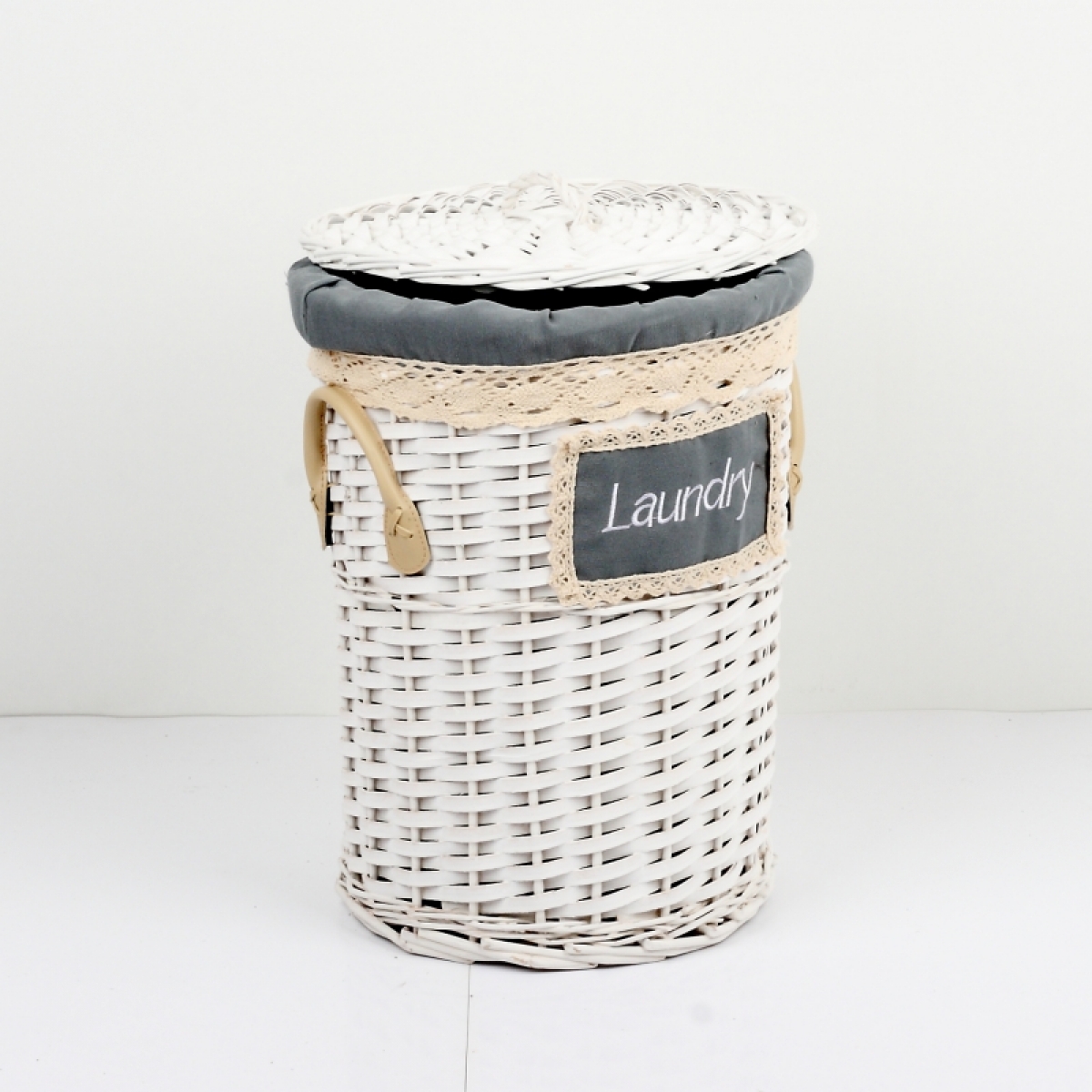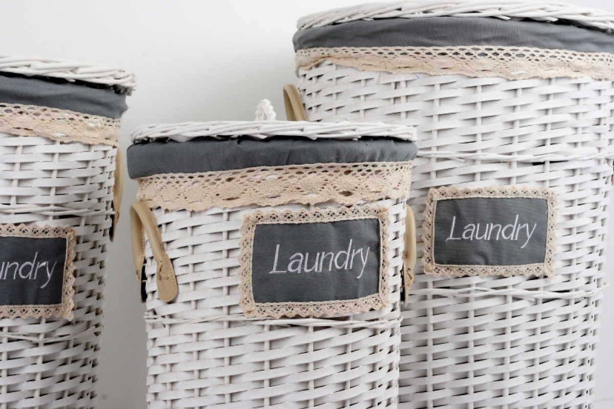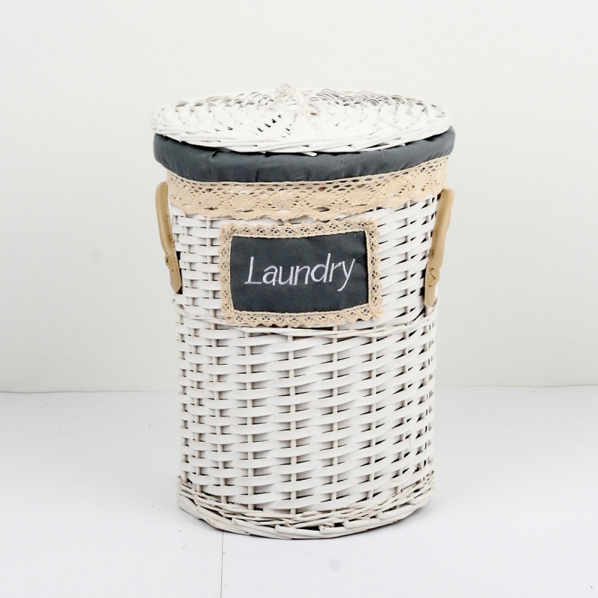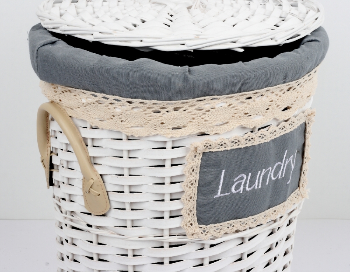 Bielý prútiený kôš na bielizeň s koženými pútkami a čipkovou stuhou.