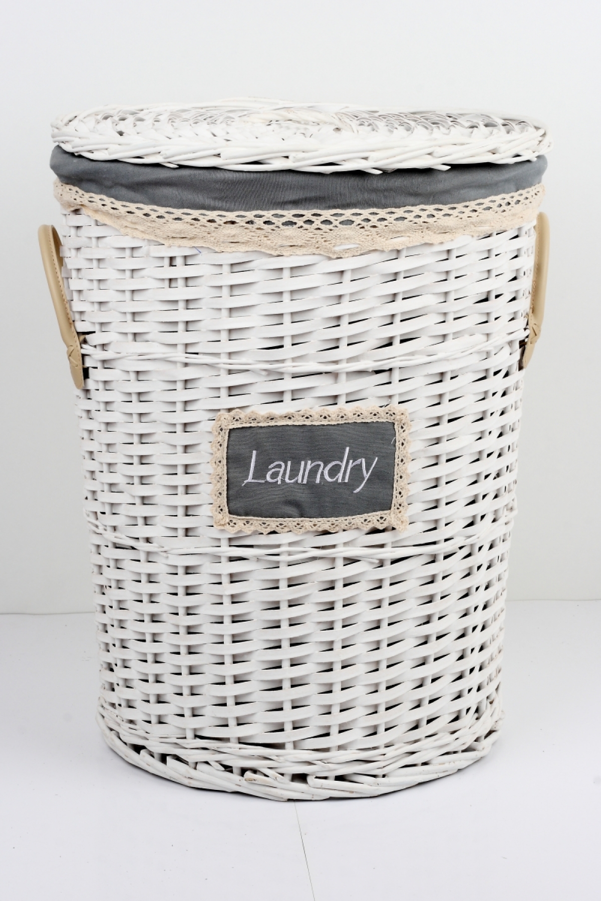 Bielý prútiený kôš na bielizeň s koženými pútkami a čipkovou stuhou.