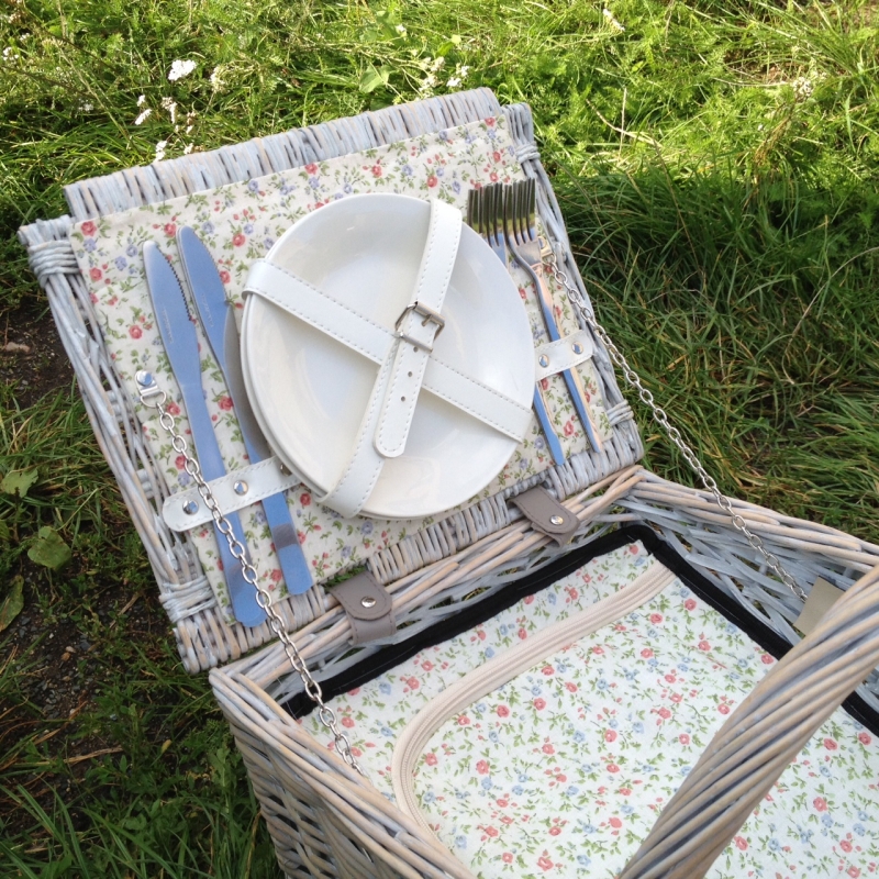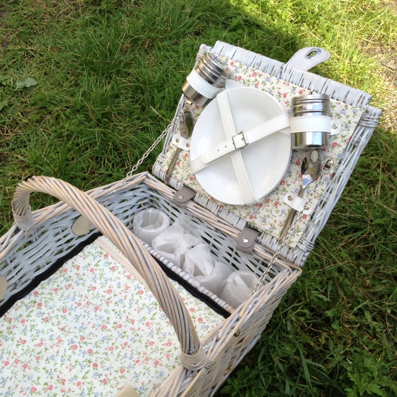 Popruhy na taniere, otvory na príbory a úchytky koše sú z koženky v bielej farbe. Látka, ktorá je v piknikovom koši použitá má jemný motív kvietkov.