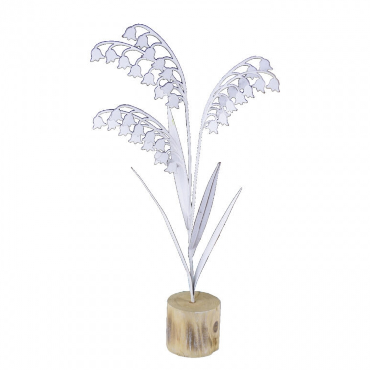 Kovová dekorácia lúčnych zvončekov v bielej farbe na drevenom podstavci