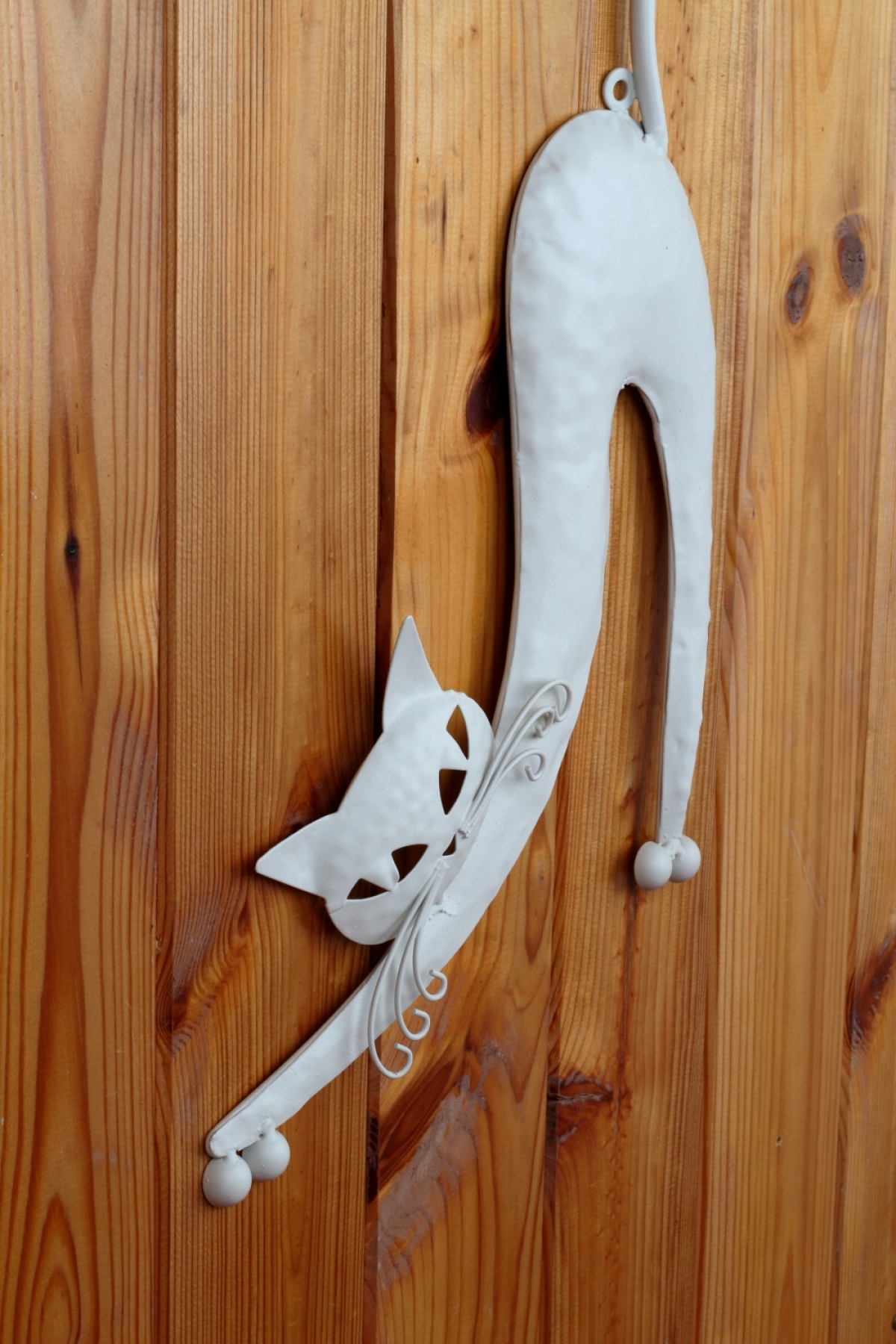 Kovová dekorácia na stenu mačka biela 25x49cm na steny v interiéri aj ako dekorácia fasády, alebo stien pod záhradným posedením.