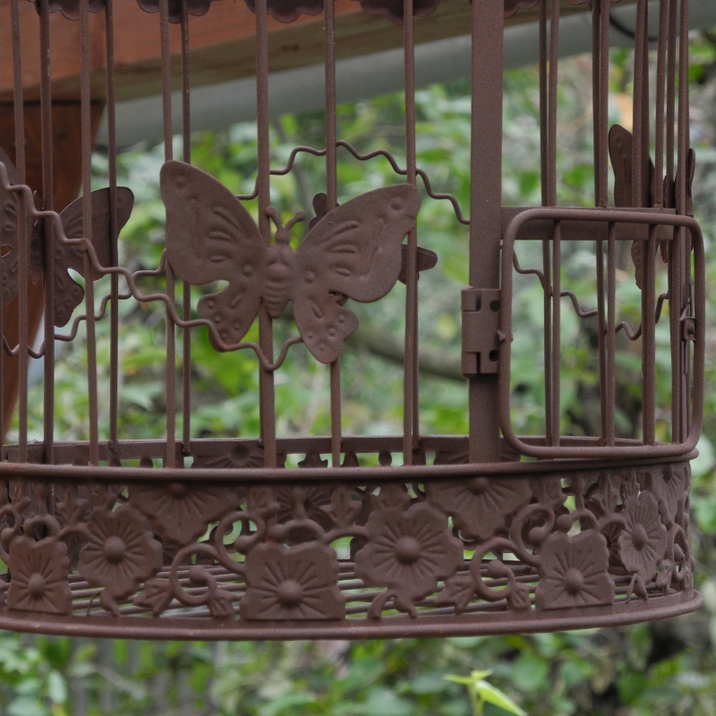 Retro klec na ptáčka o celkové výšce včetně kovového háčku 41cm a průměru 20cm, zdobená vážkou a drobnými květy. Materiál: kov.