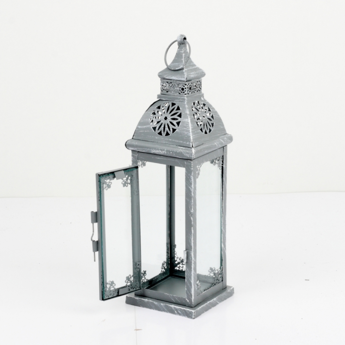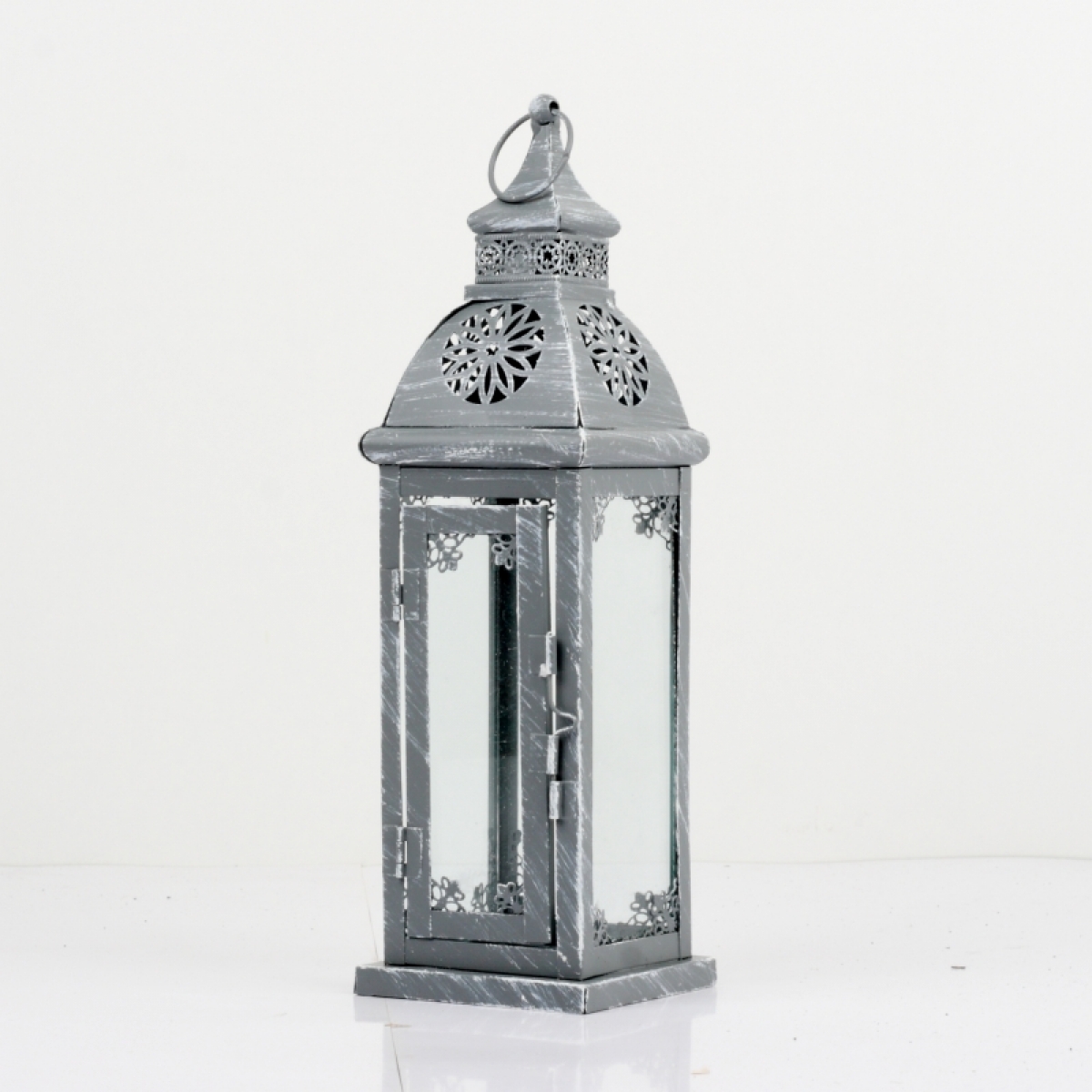 Kovová lampáš sivá s patinou zdobená 52cm rozžiari svetlom sviečky celý priestor obývacej izby, chodby i vonkajšie sedenie pod zastrešenou pergolou. Príjemnú a útulnú atmosféru si môžete vytvoriť kdekoľvek budete chcieť.