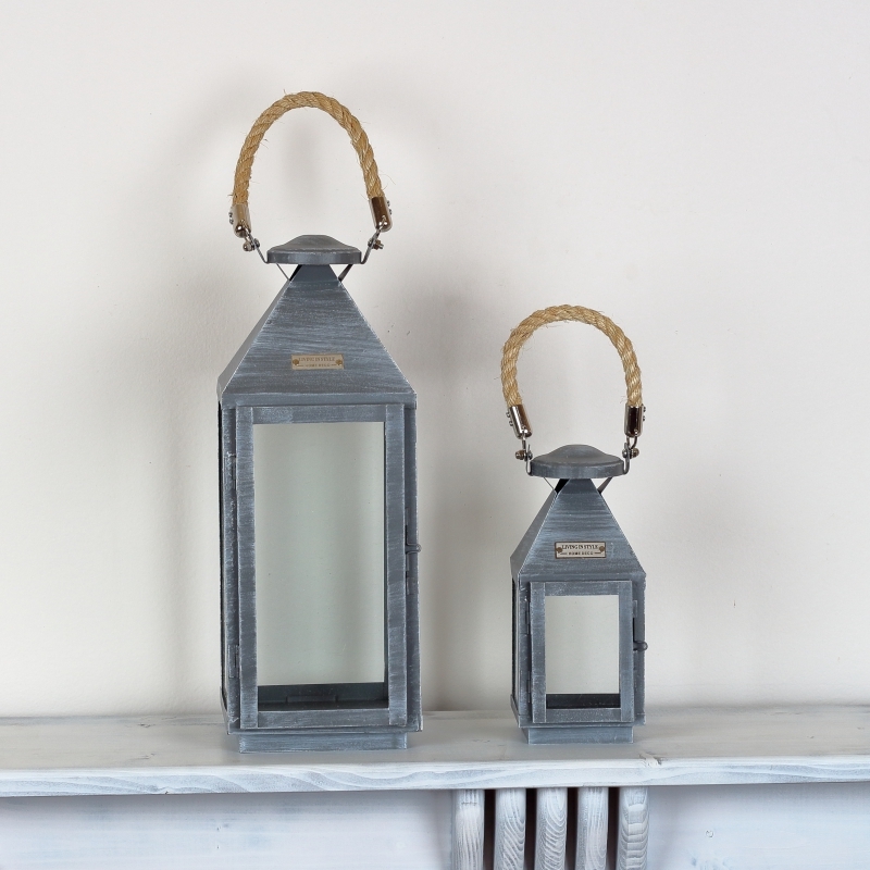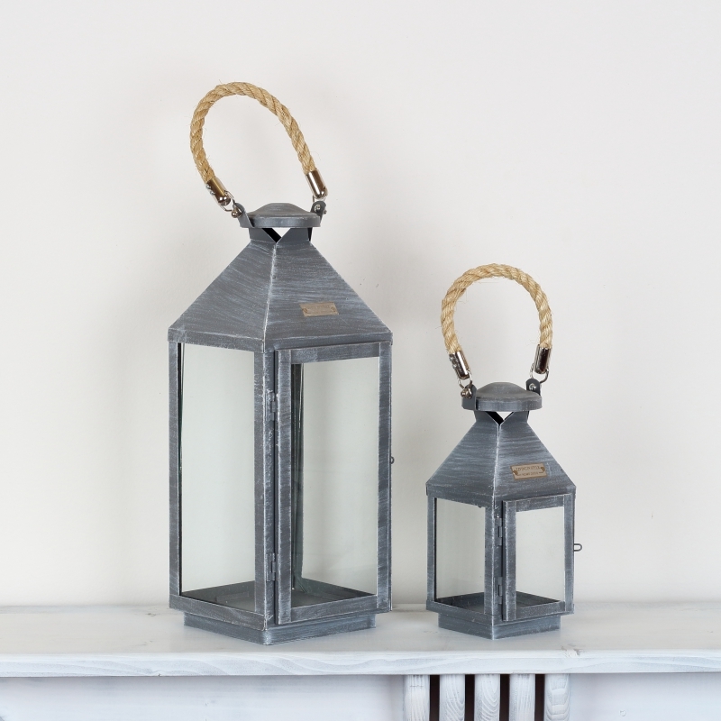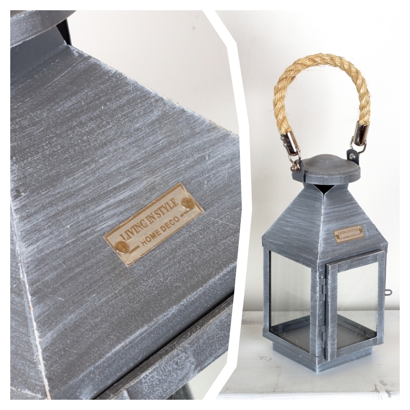 Kovová lampáš sivá najmenší 25cm má decentný šedú farbu s jemnou patinou a je doplnená o masívny povraz, ktorý tvorí ucho lucerny.