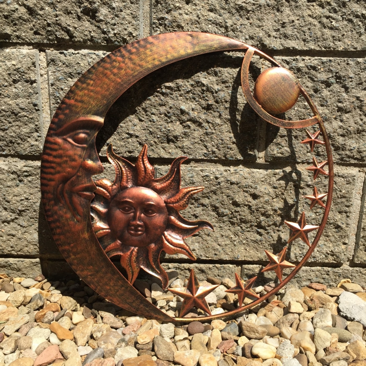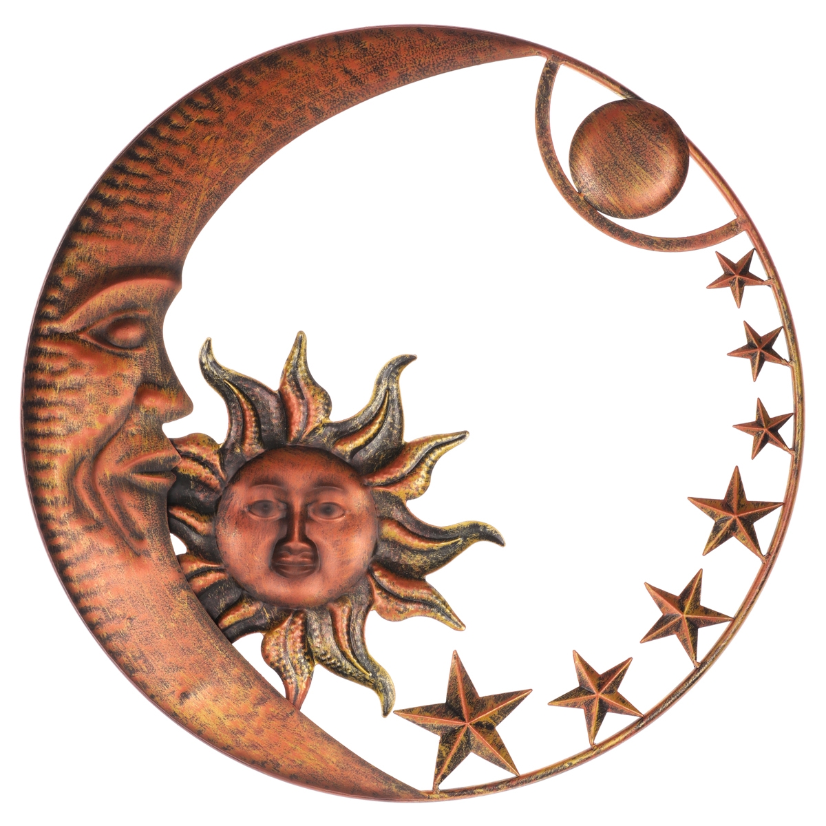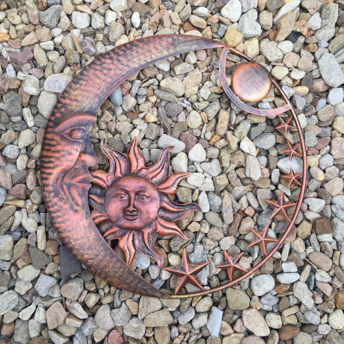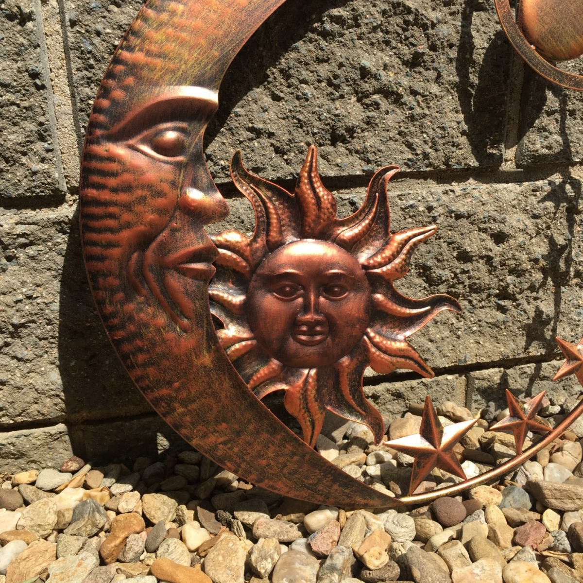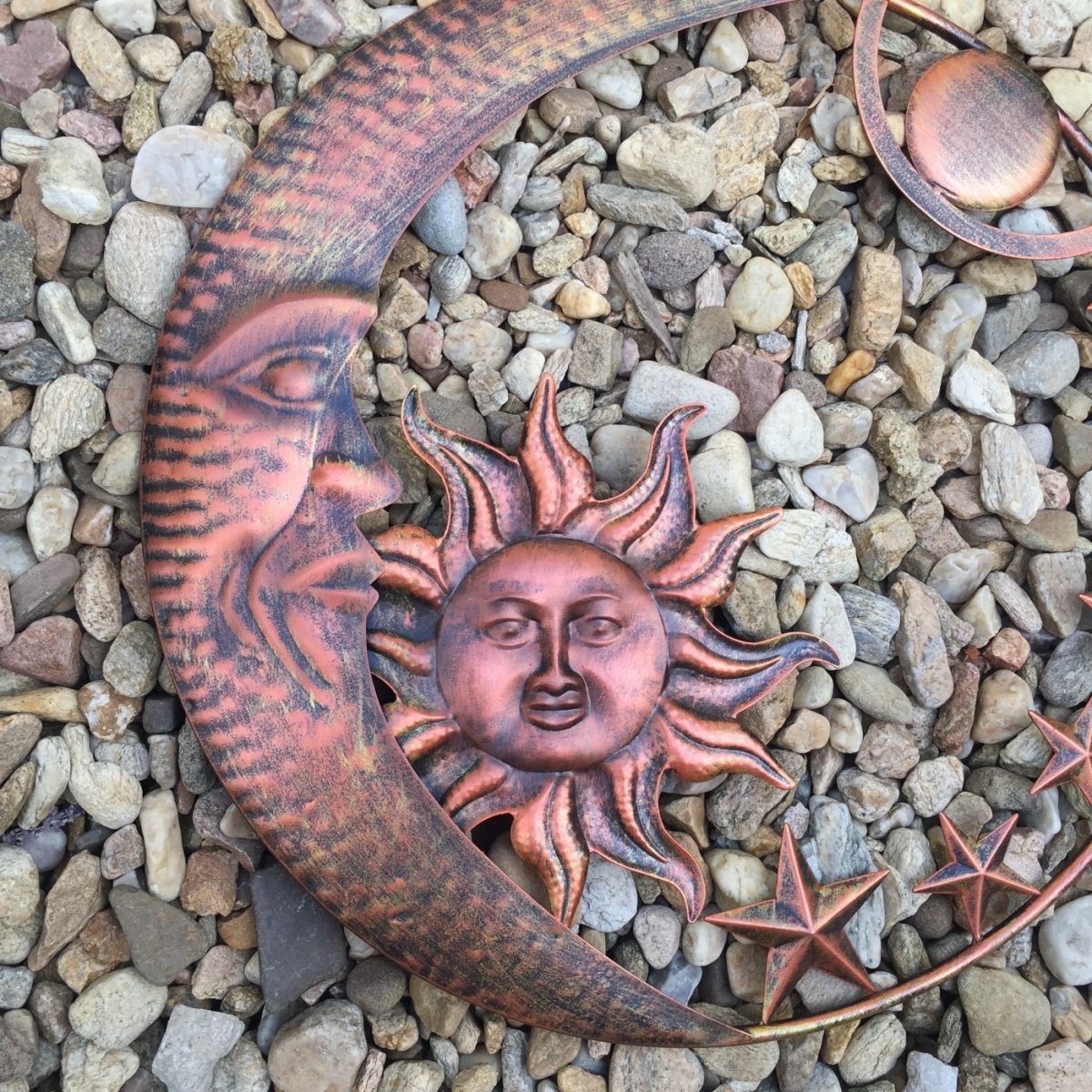Kovová nástenná dekorácia doslova ako z rozprávky Tisíce a jednej noci stvárňuje slnko, mesiac a hviezdy. Pôsobivé farebné prevedenie medenej a zlatej farby a tieňovanie čiernou patinou robia z tejto dekorácie zaujímavý kúsok, ktorý bude korunou každej steny.