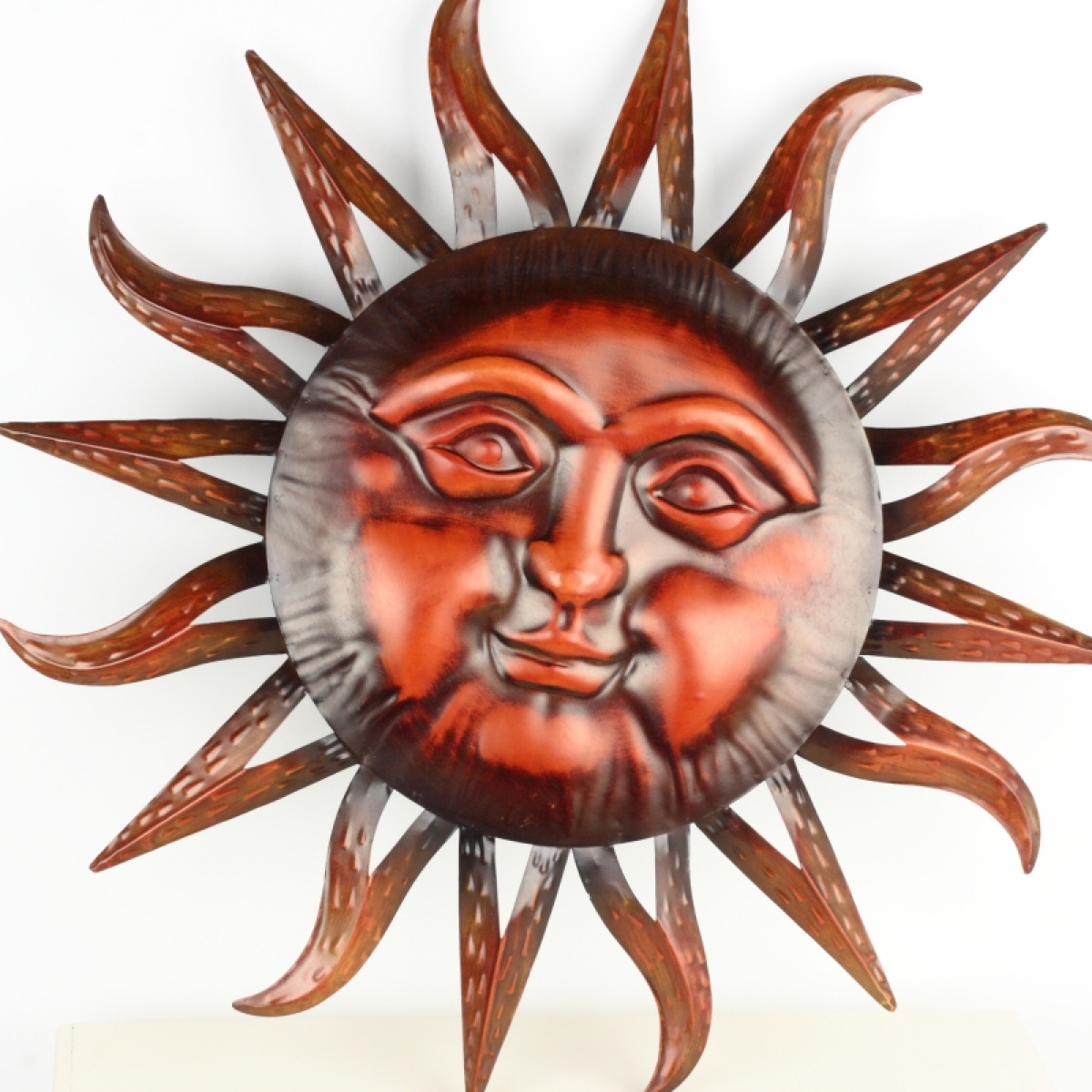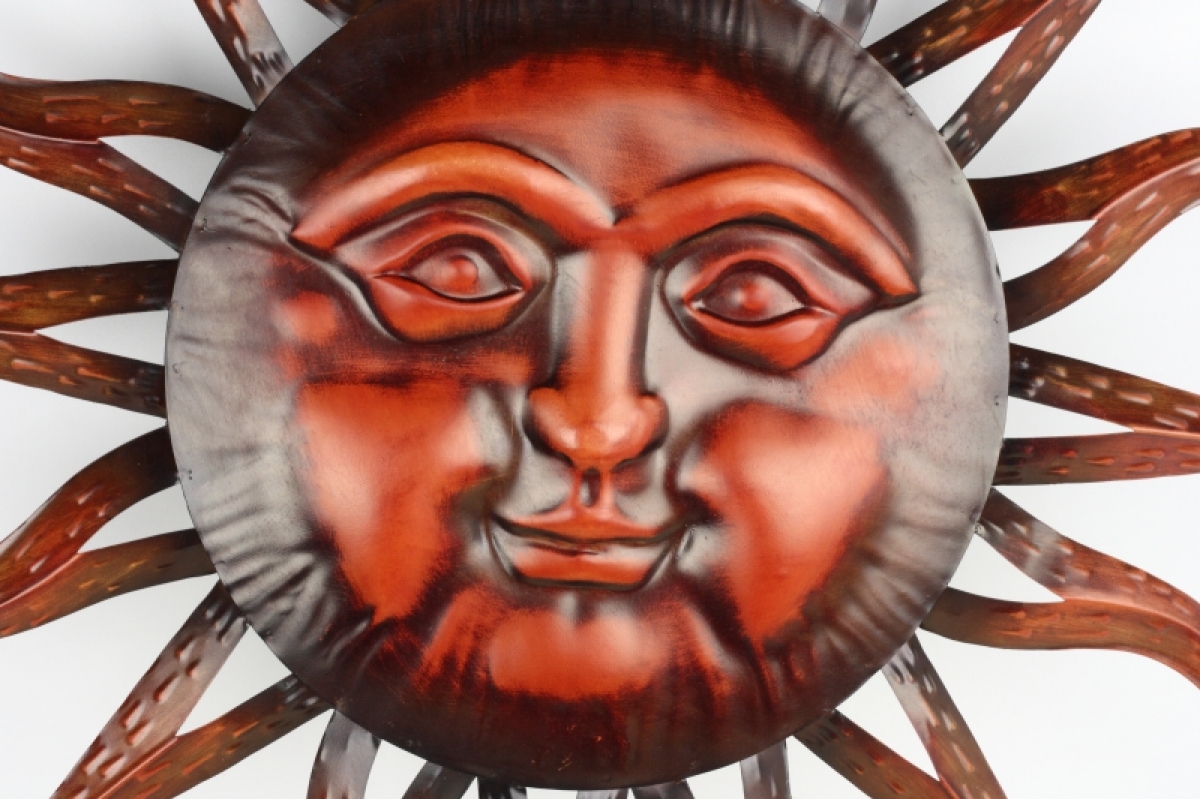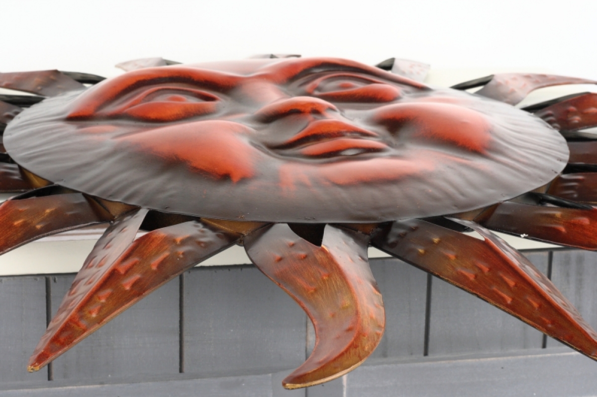 Kovové slnka s plastickým tvárou má nádhernú tehlovú farbu a žíhané lúče.