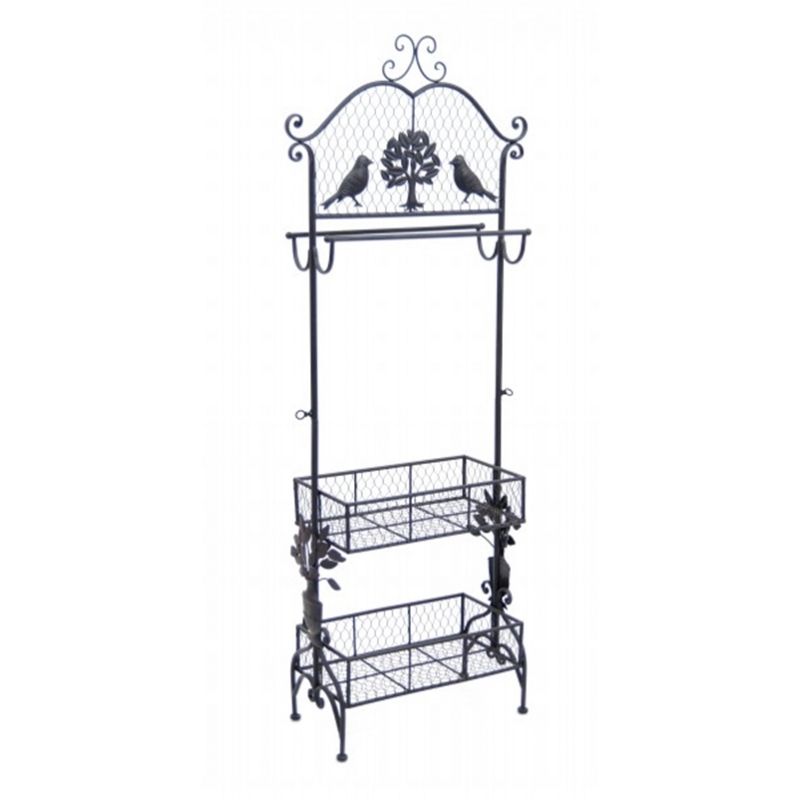 Konštrukcia stojí na štyroch nožičkách, ktoré priamo nadväzujú na prvú policu - kôš. Koše sú z kvalitného králičieho pletiva. Po stranách je konštrukcia zdobená lístkami od stromov. Vo vrchnej časti sú dve kovové tyče pre zavesenie potrebných vecí.
