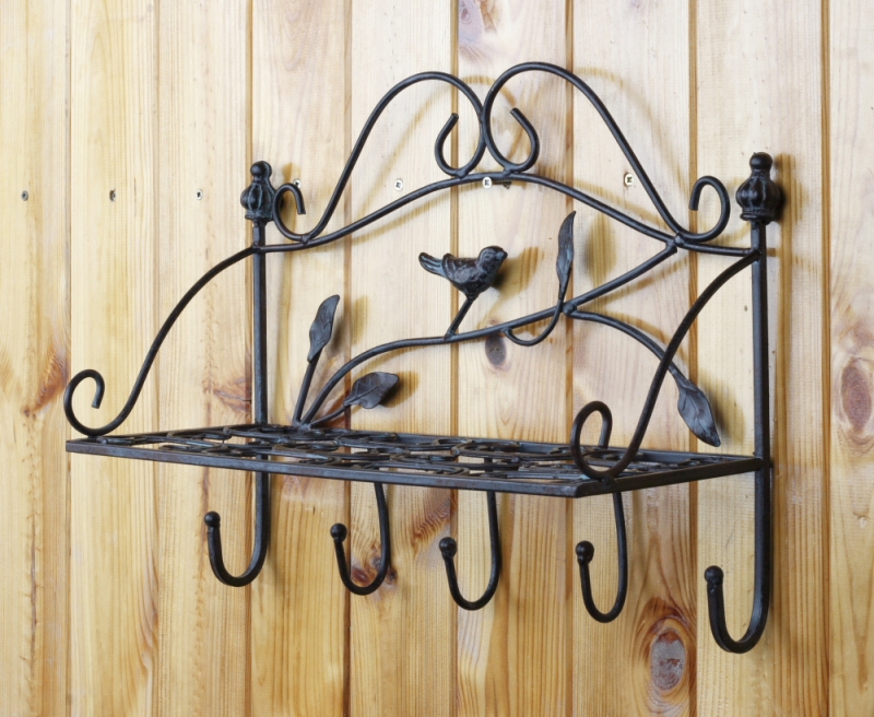 Samotná police je zdobená ornamentmi a v spodnej časti je päť kovových háčikov. Zadnú stranu stráži vtáčik na vetvičke.
