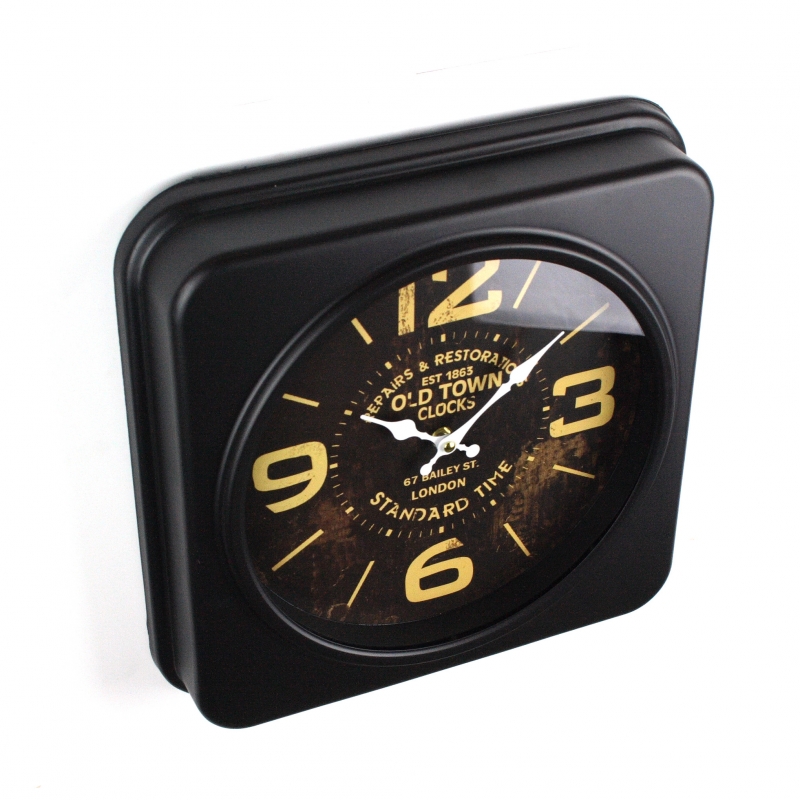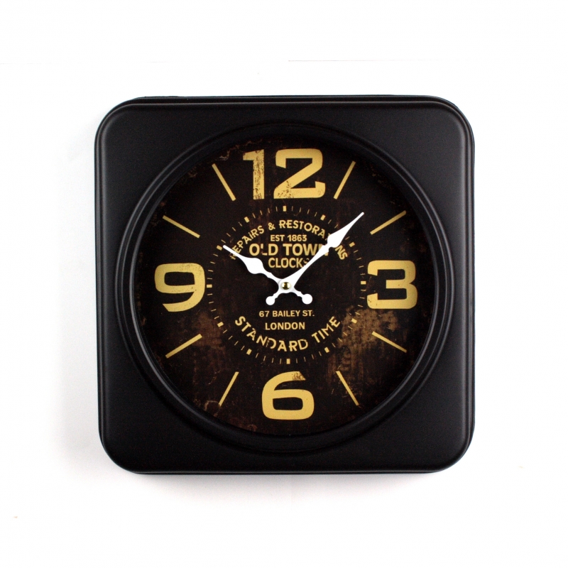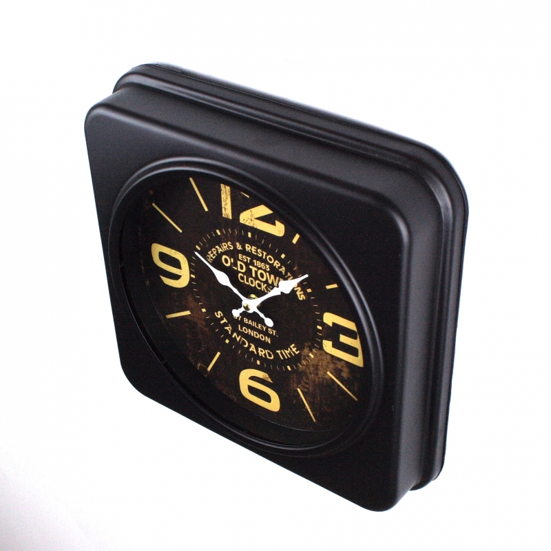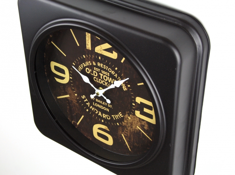 Hodiny v tvare štvorca v temných farbách s veľkými číslicami.