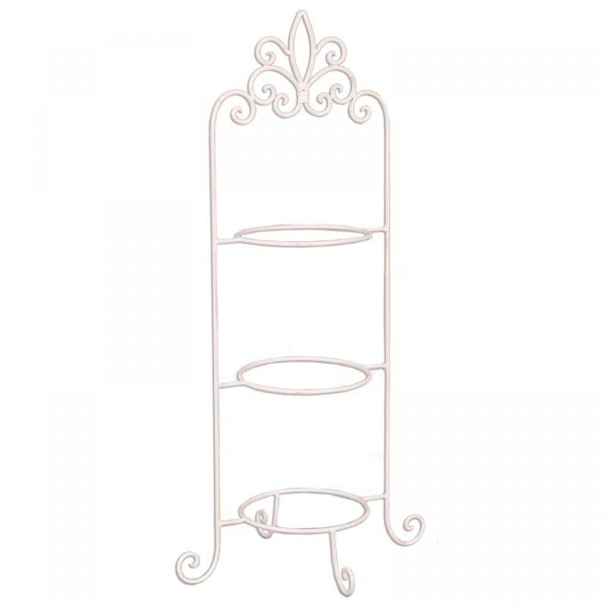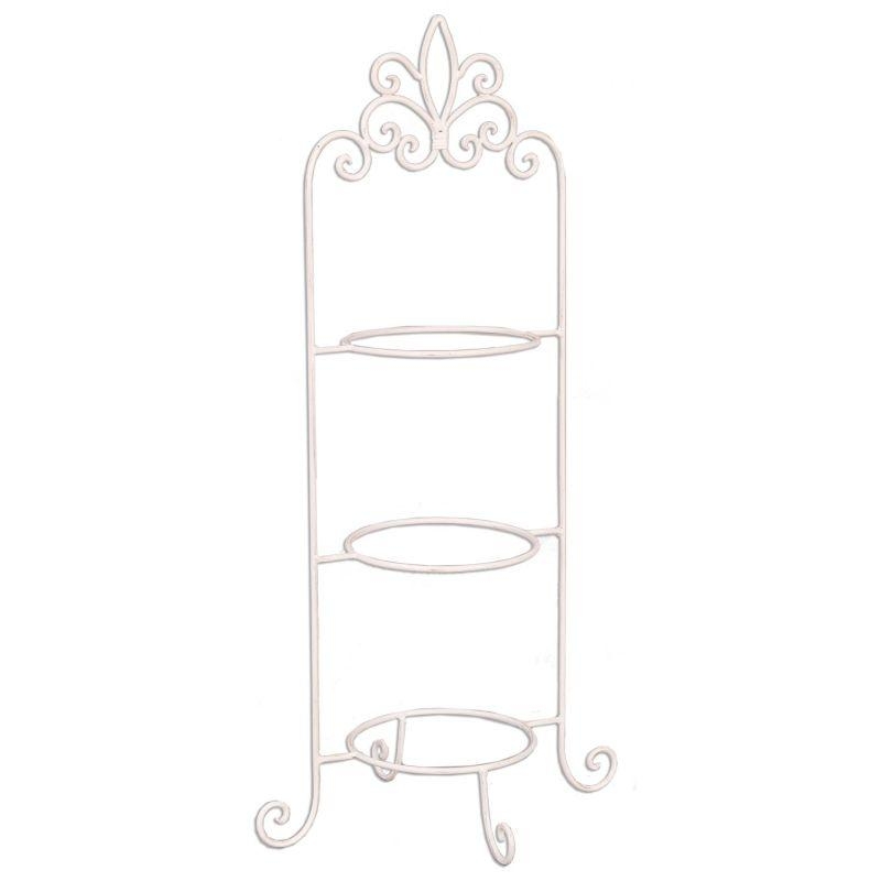 Vysoký kovový třípatrový etažér, bílá barva s patinou.