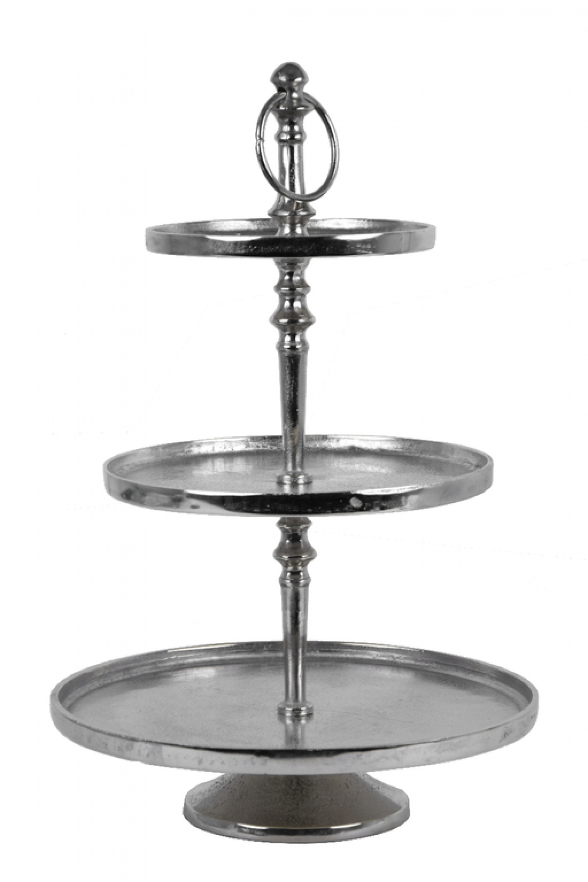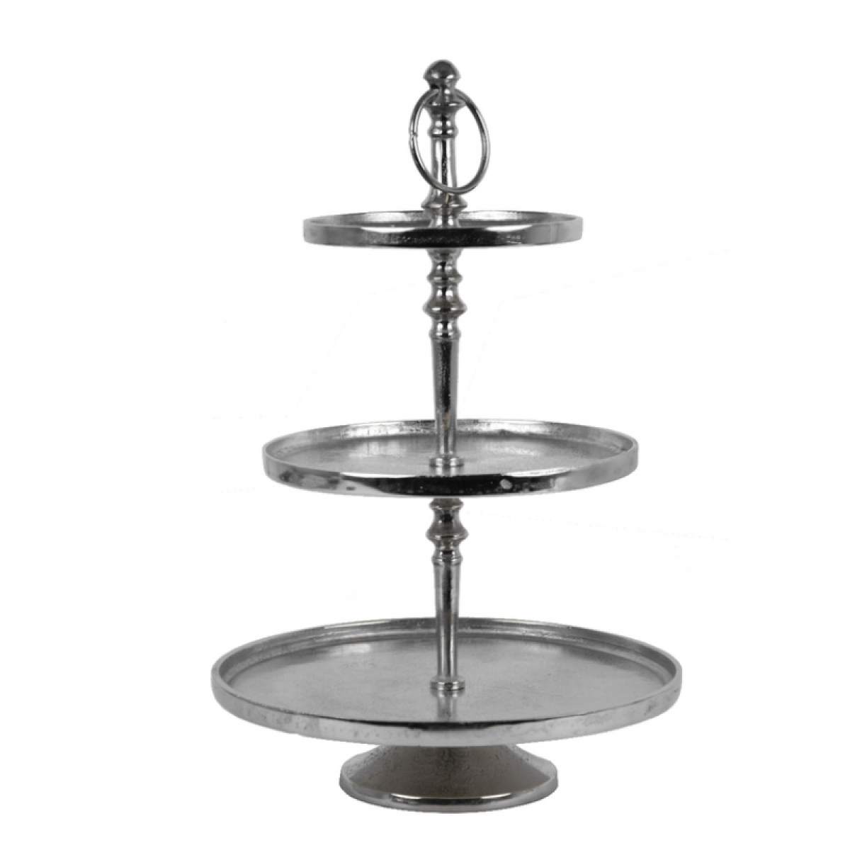 Stabilný trojposchodový etažér niklový na cukrovinky i ovocie.