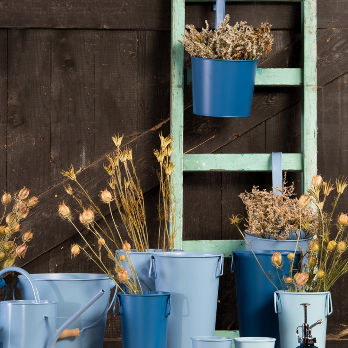 Kovový kýbel vo svetle modrom prevedení.