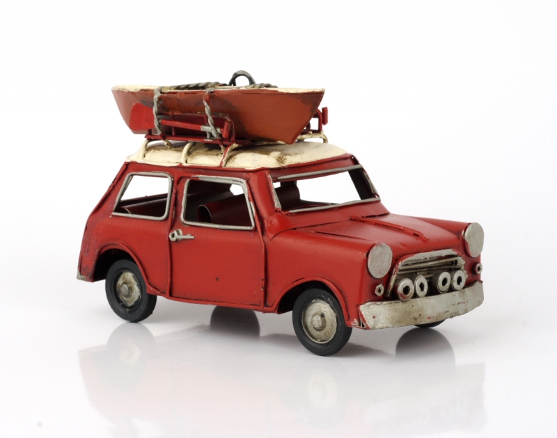 Model červeného auta s kajakom, kufrom a pádlami na streche je vyrobený z kovu a jedná sa o zberateľský predmet (dekoráciu), nie hračku.