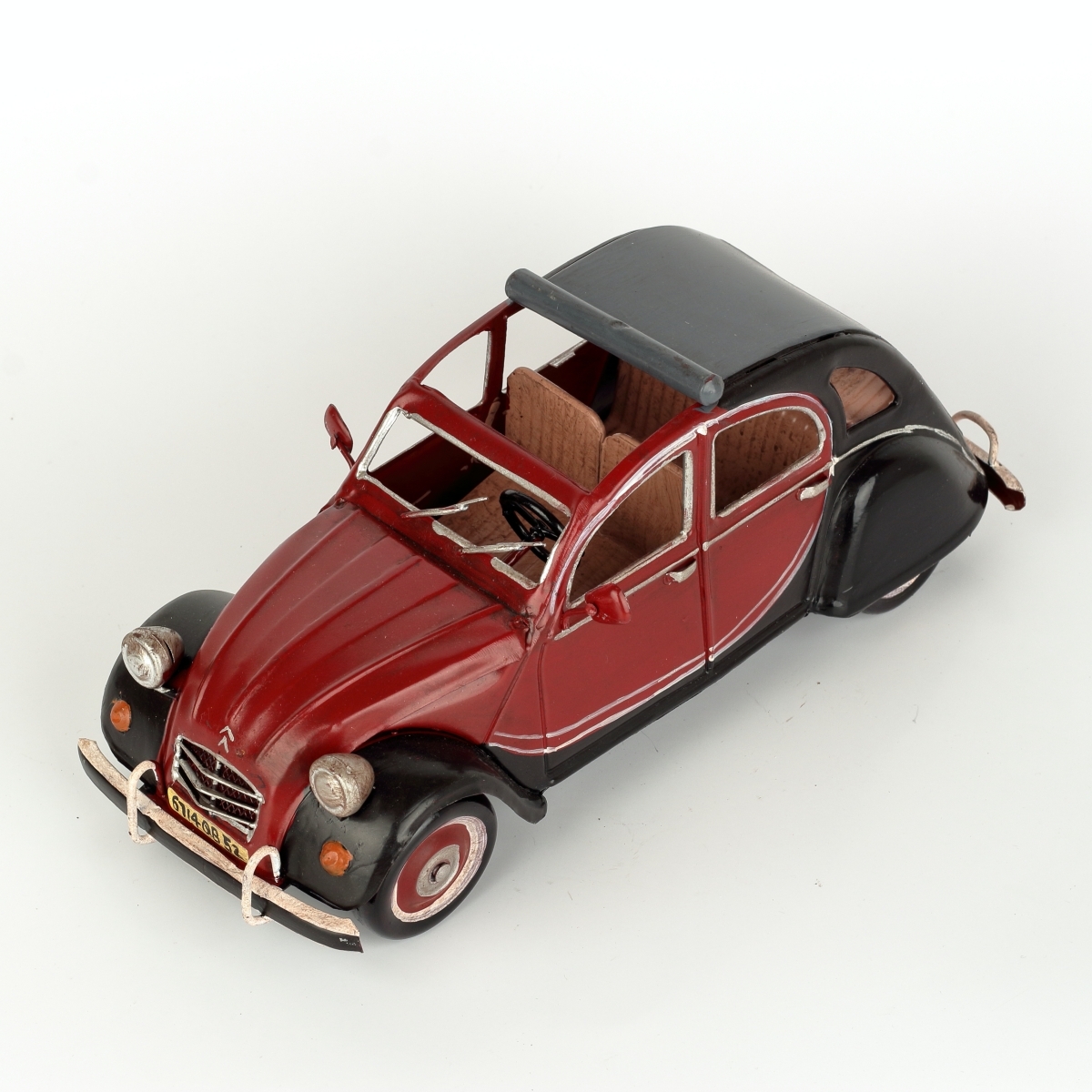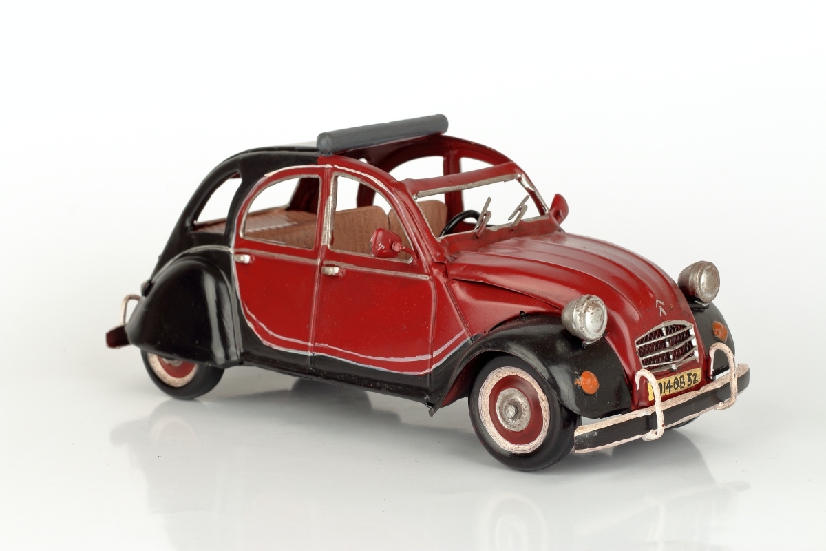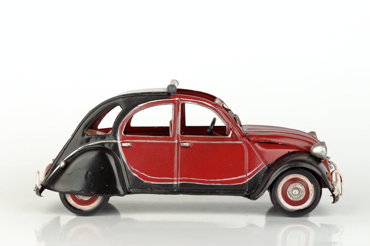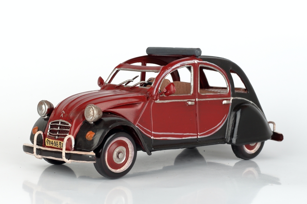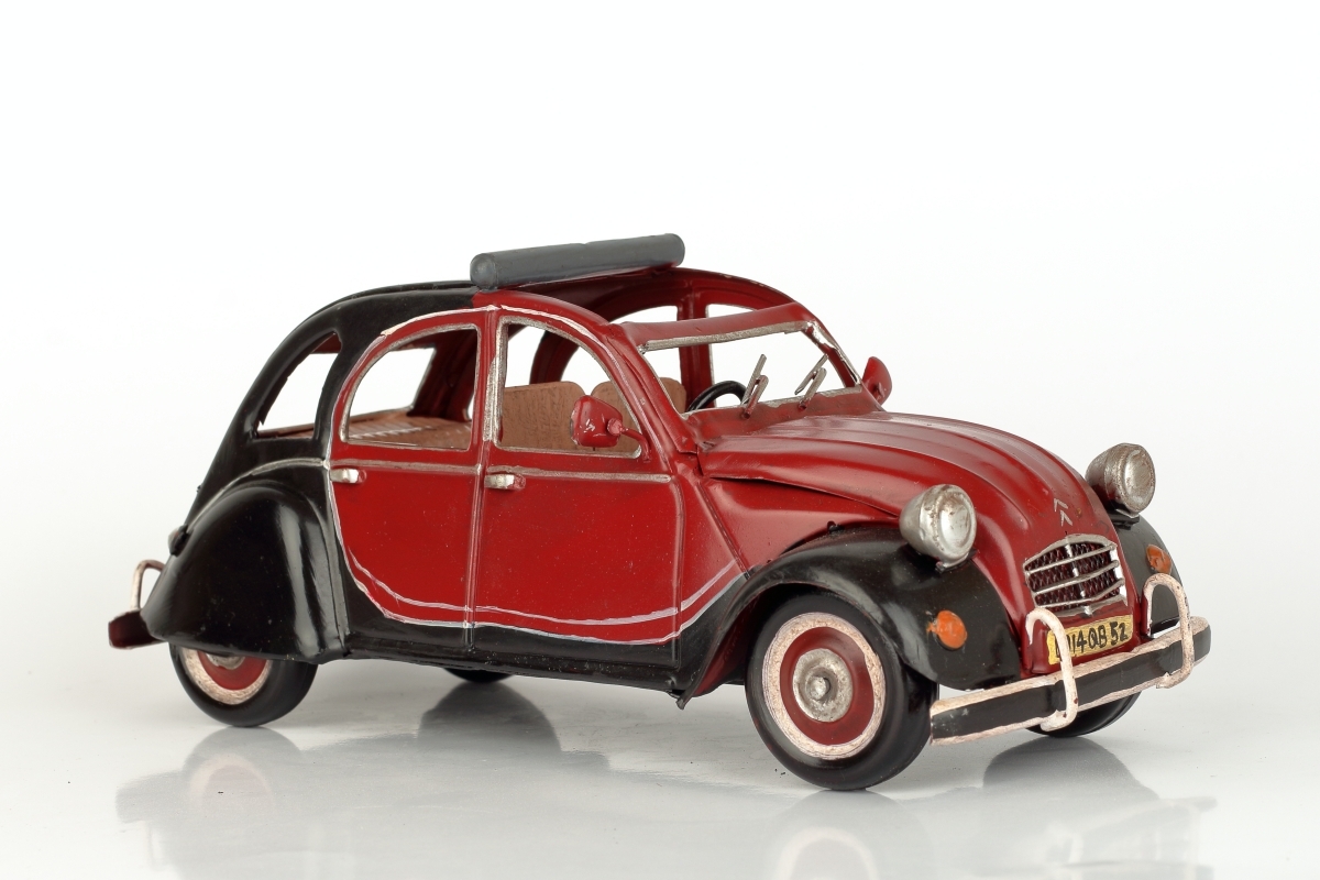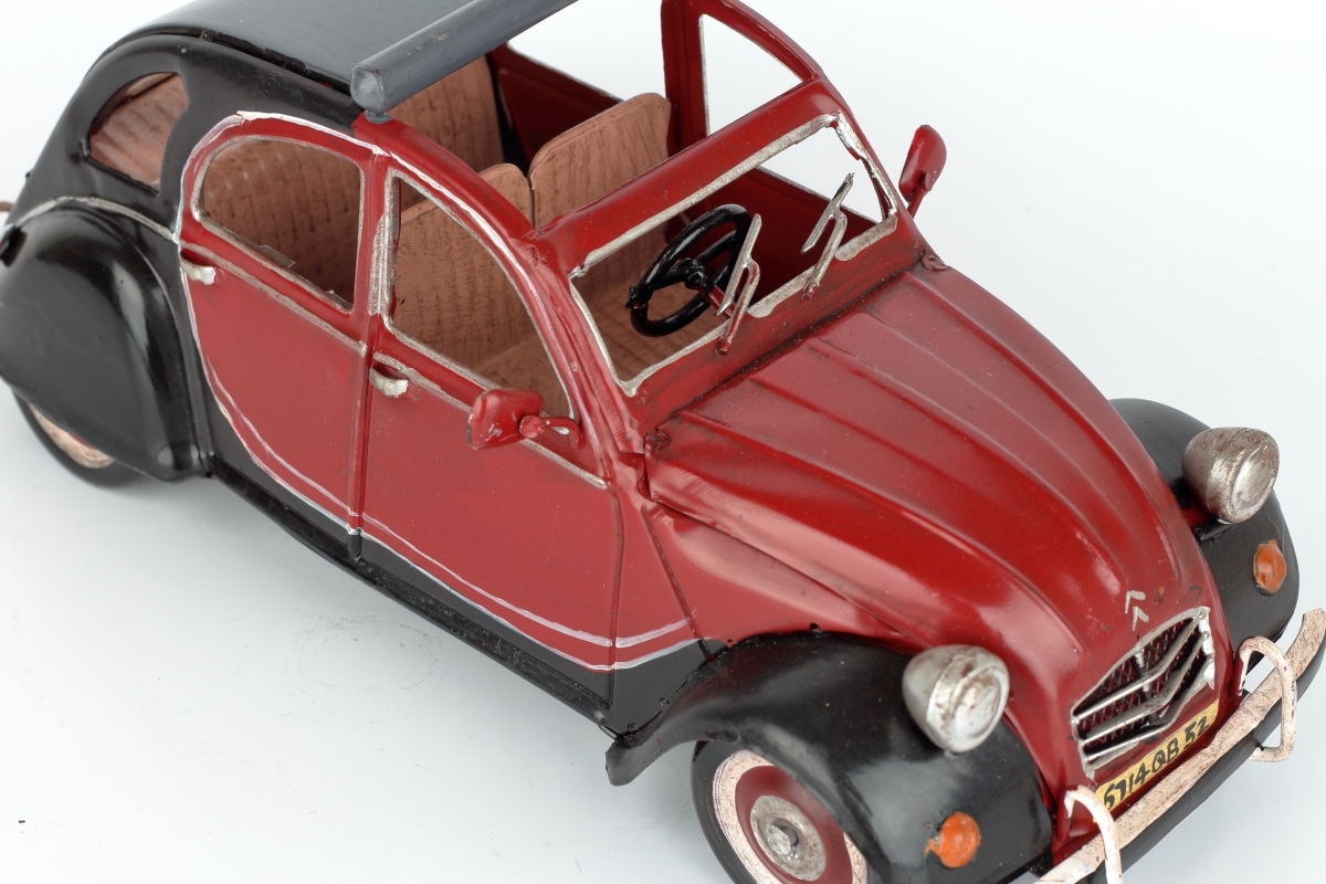 Kovový model auta - francúzskeho veterána, podobného slávnemu Citroën 2CV, v červeno-čiernej kombinácii