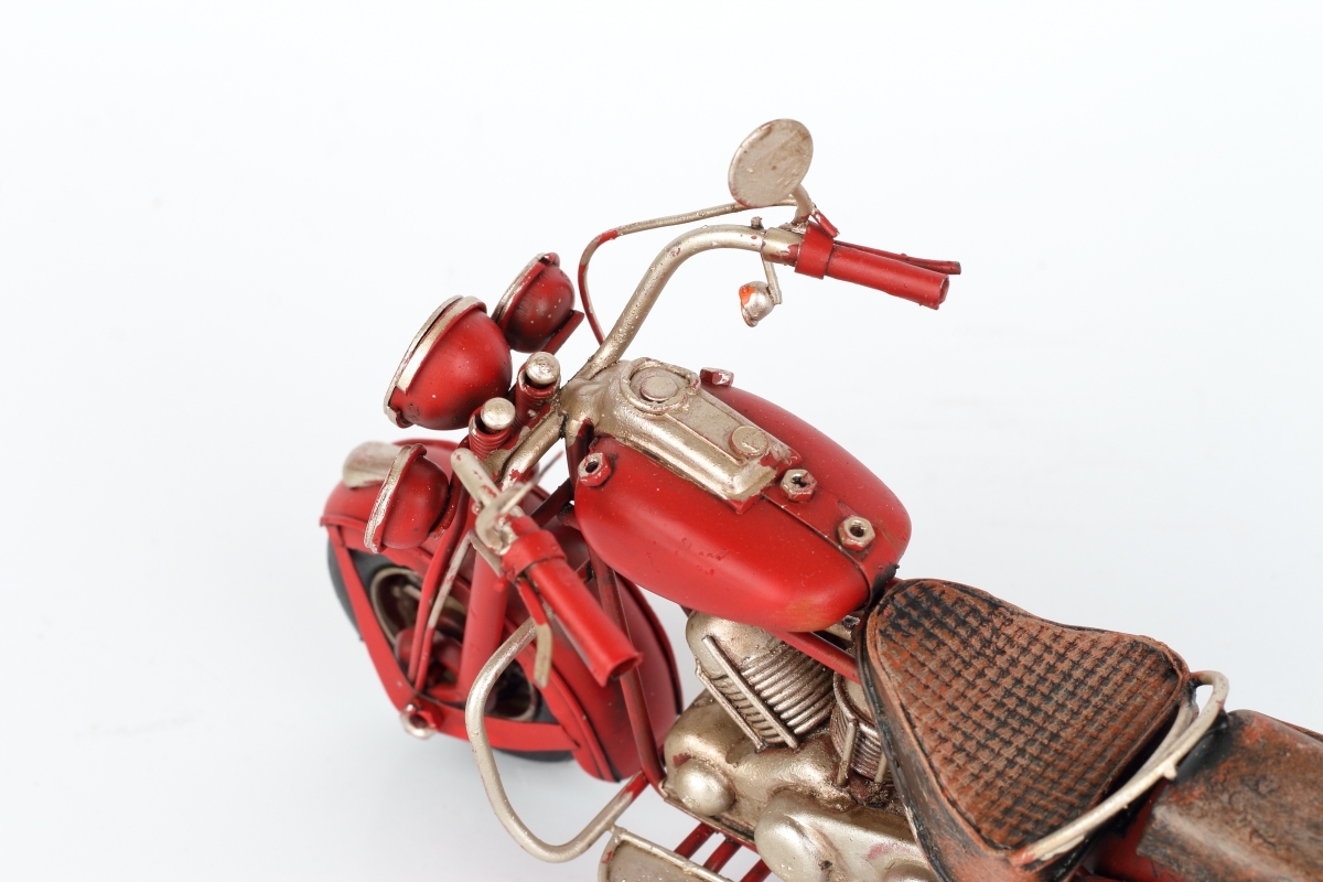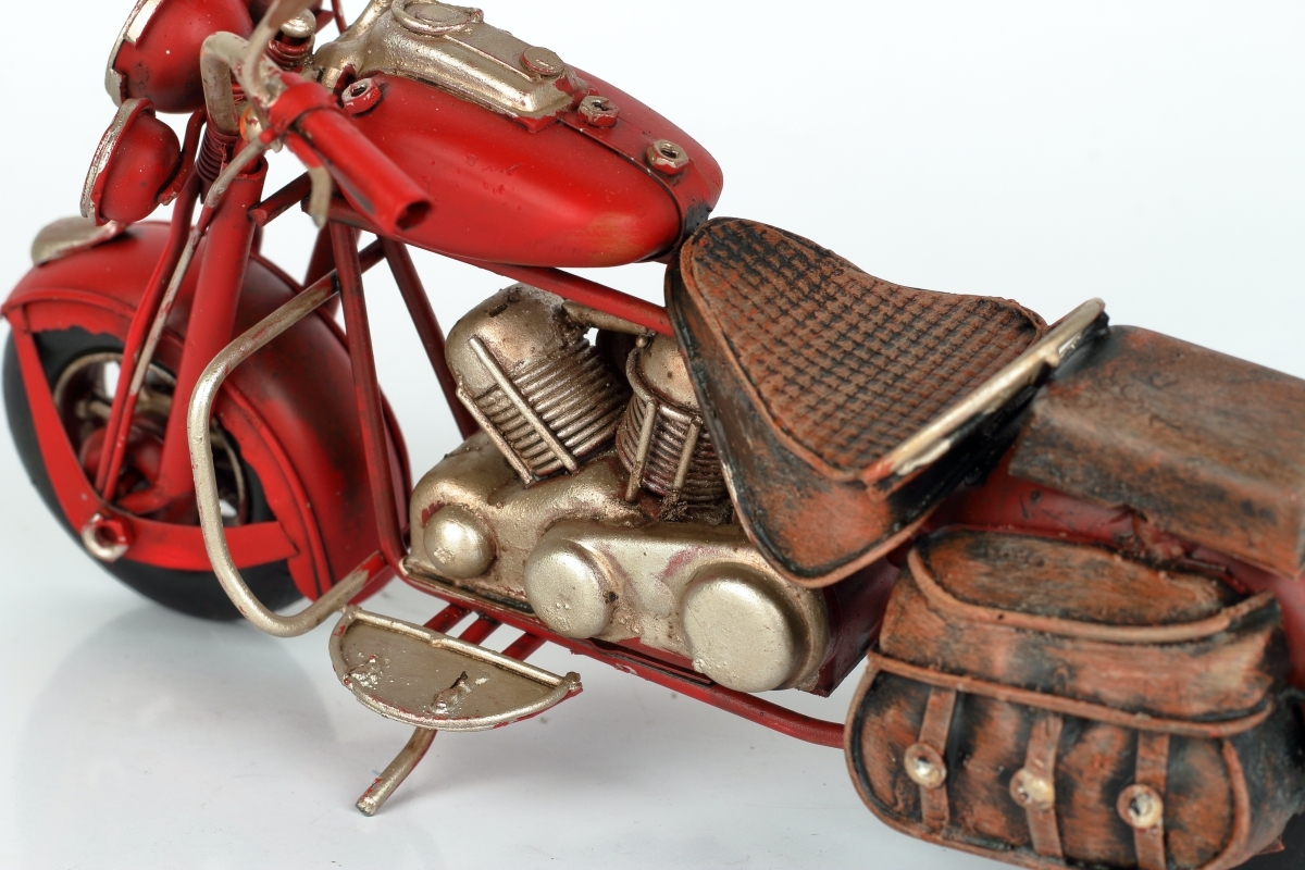 Kovový model motorky s červeným blatníkom a hnedým sedákom