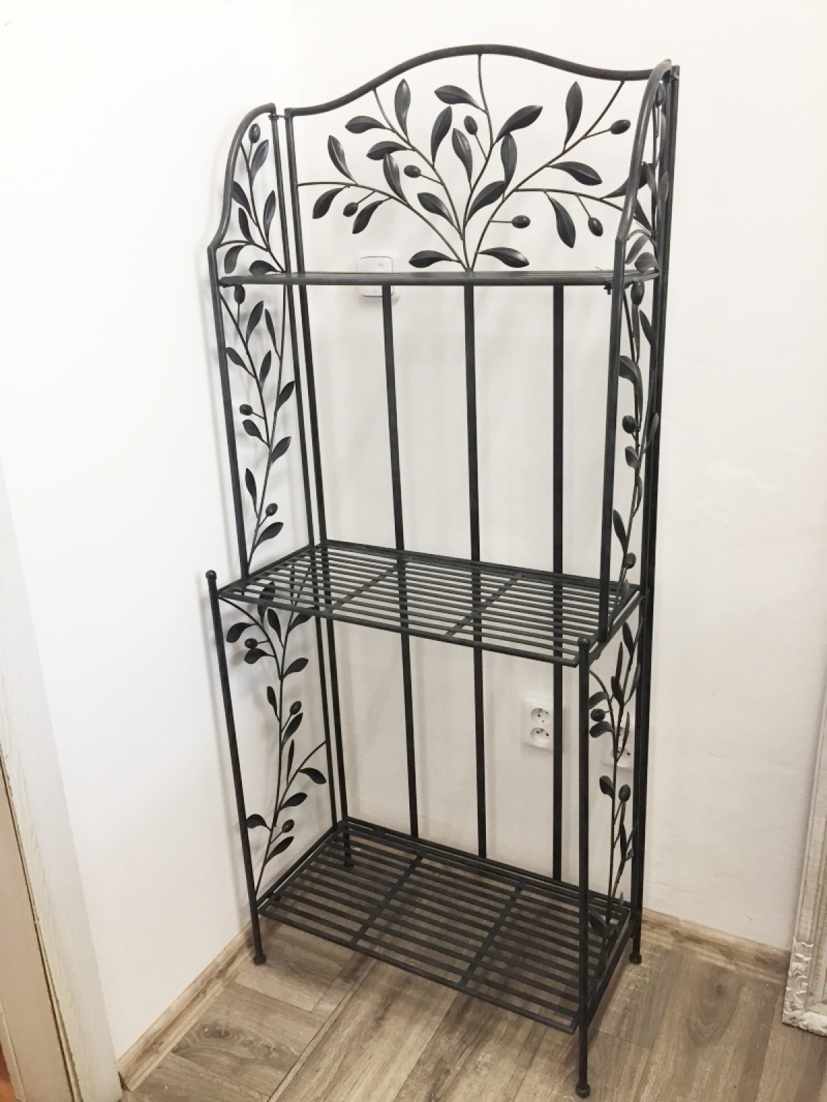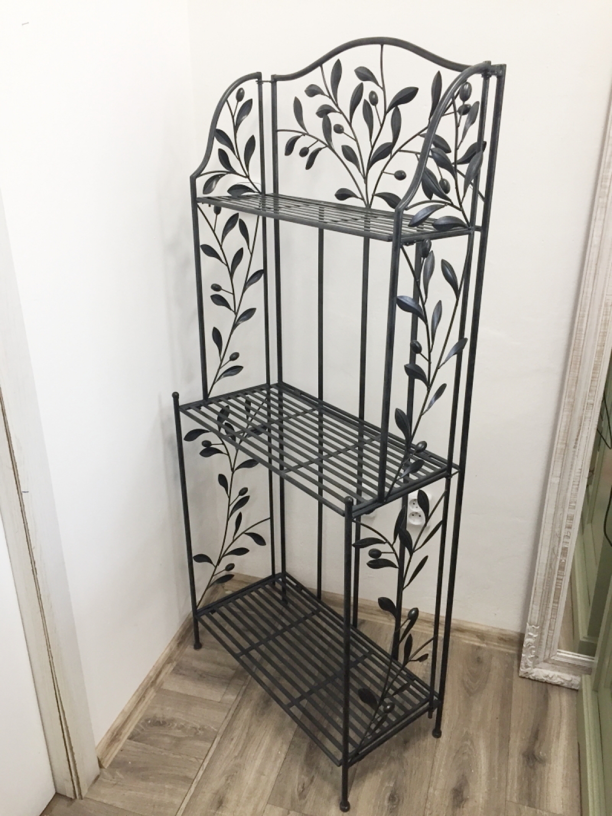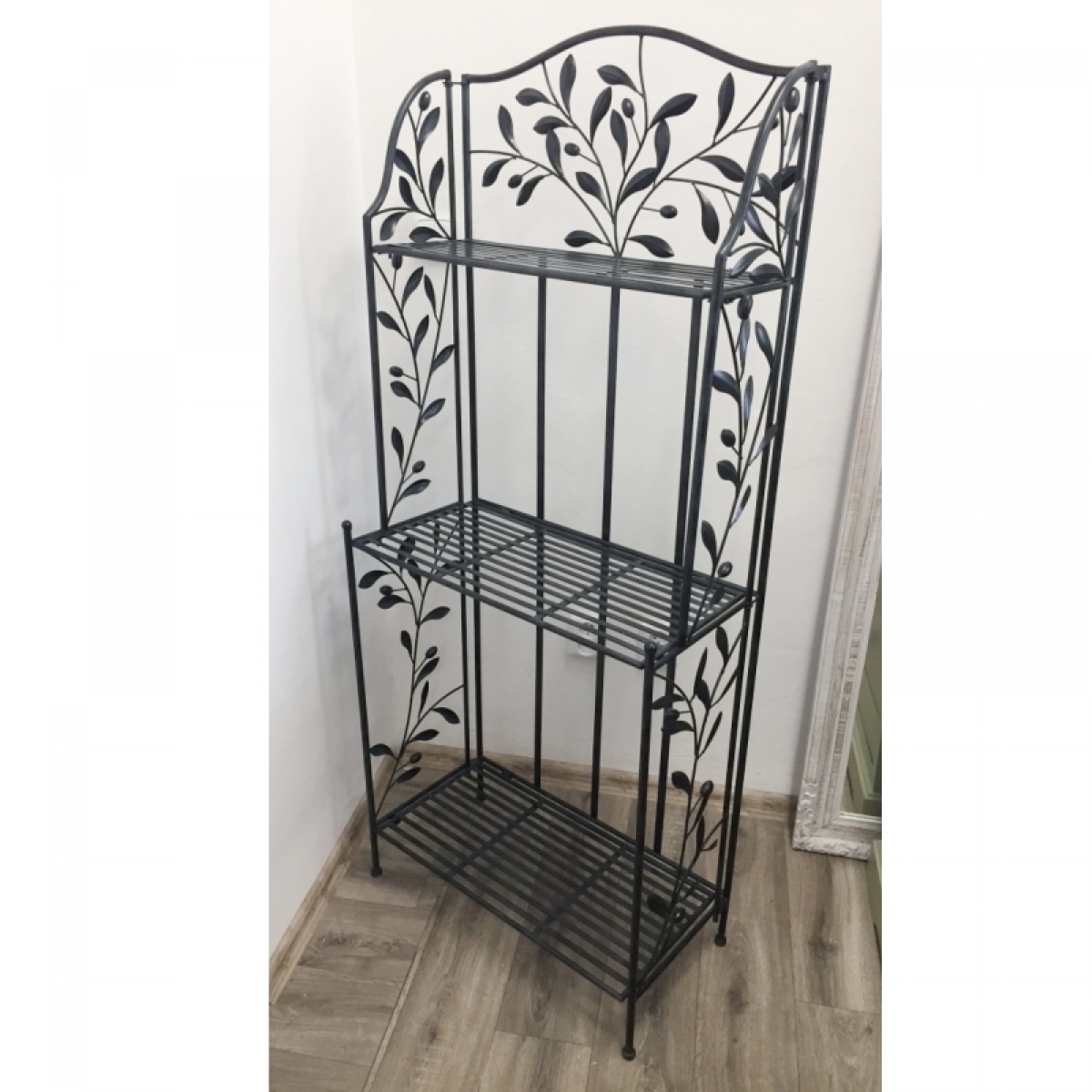 Kovový regál na kvety sa skladá z 3 políc a je vyrobený z lakovaného železa. Možno použiť aj v interiéri ako ozdobná polička na knihy alebo na malé spomienkové predmety.