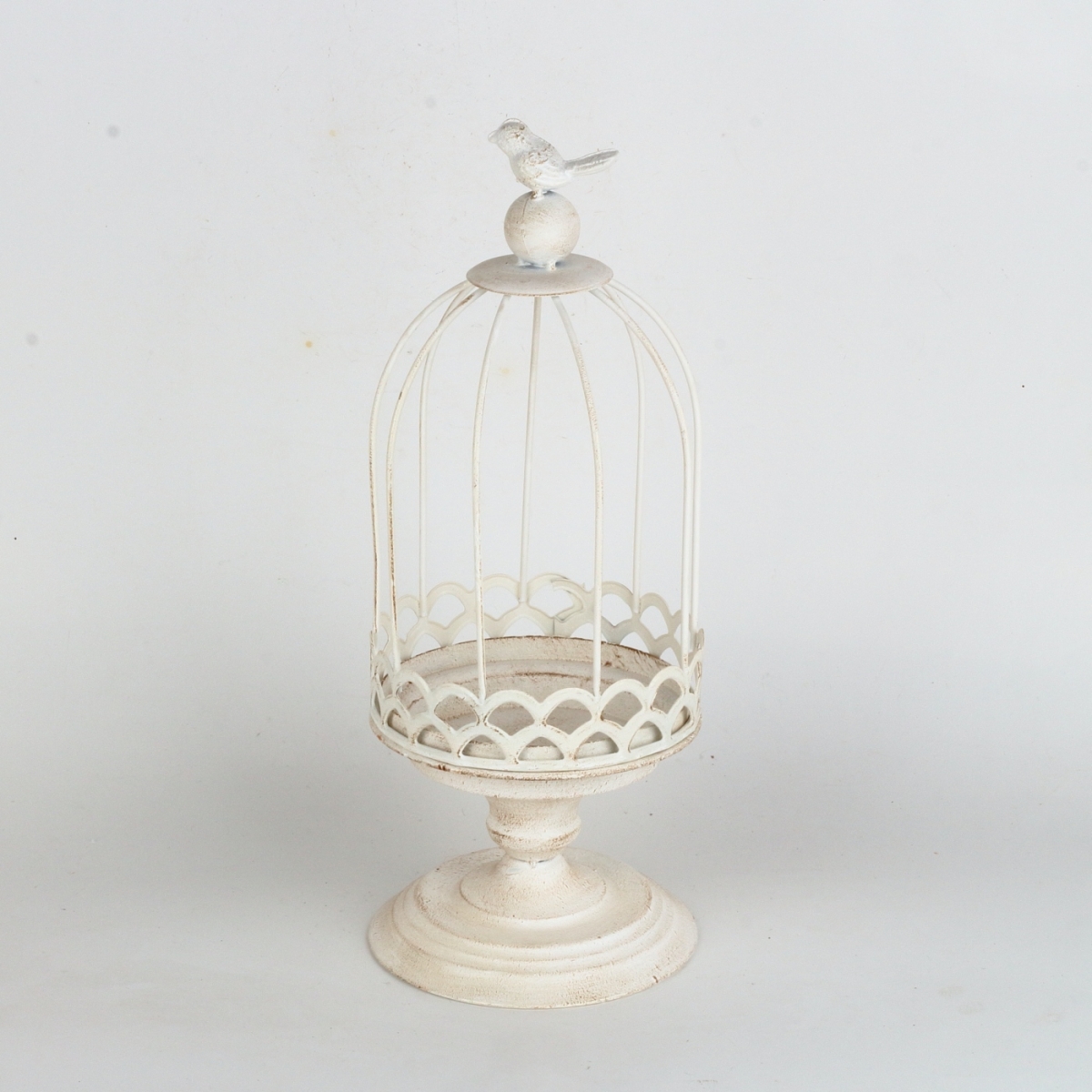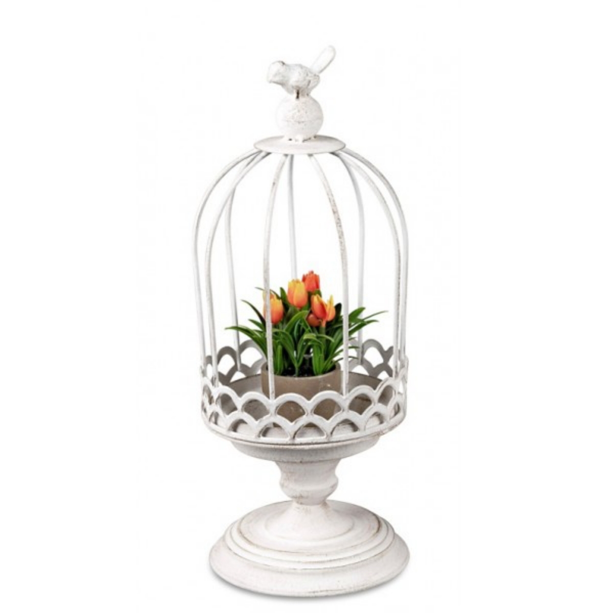 Kovový stojan na kvety vo vintage štýle imituje vtáčiu klietku.