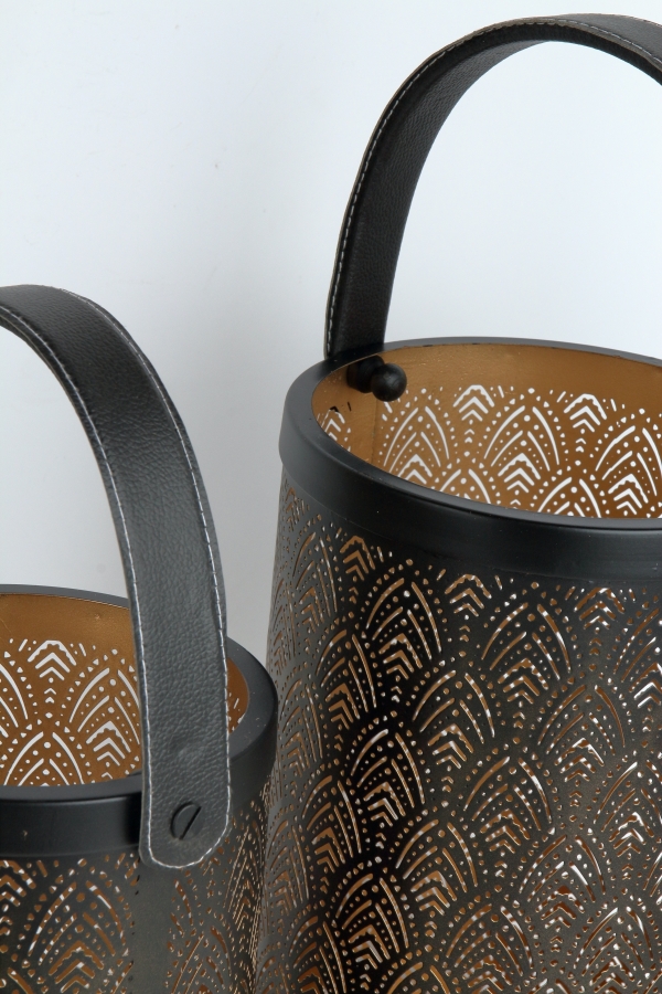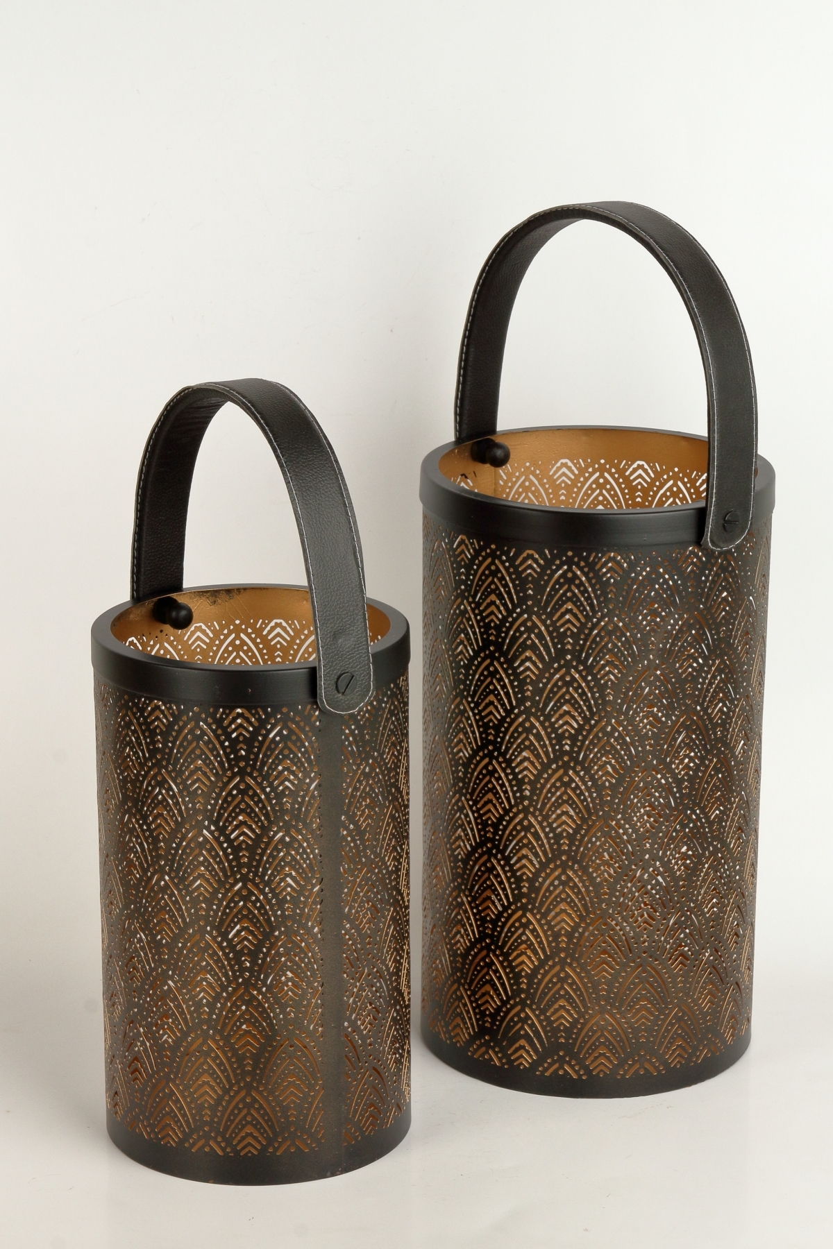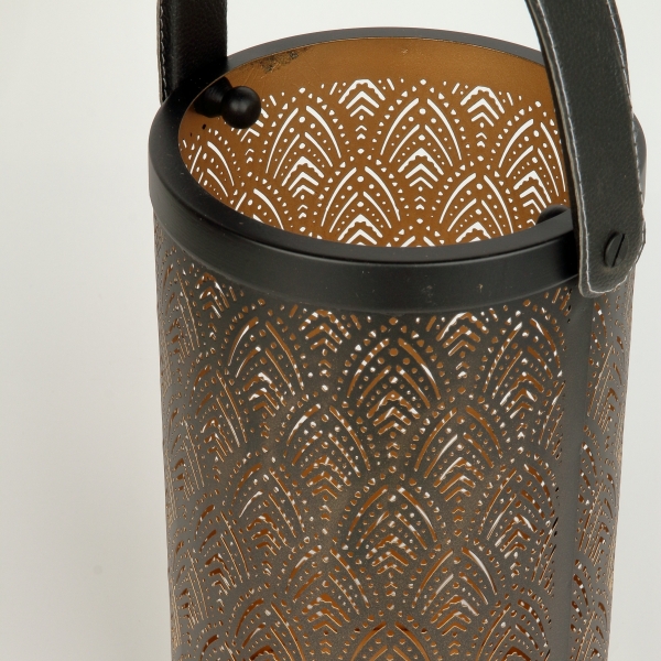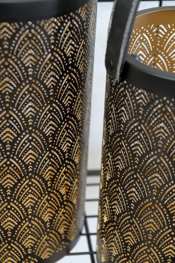 Kovový svietnik s perforovaným plášťom. Vďaka perforovanému plášťu vznikajú od zapálenej sviečky vo vnútri kovového svietnika svetelné efekty.