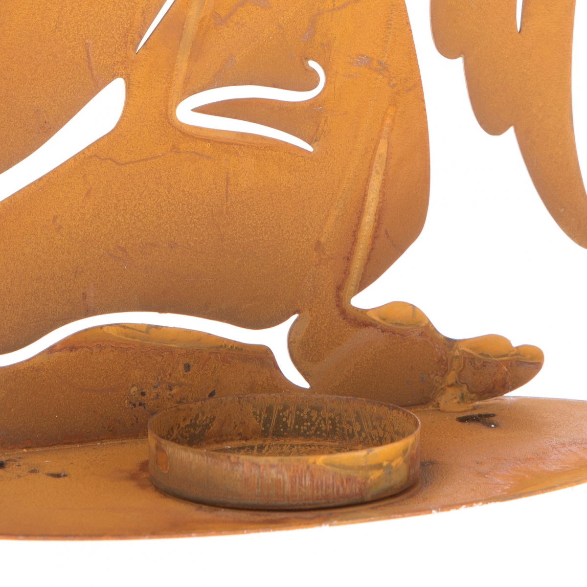 Kovový svietnik umiestnite na okraj krbu, krbovú rímsu, alebo na parapet. Vedľa kovovej sošky modliaceho sa anjelika, je priestor s okrajom na uloženie čajovej sviečky.