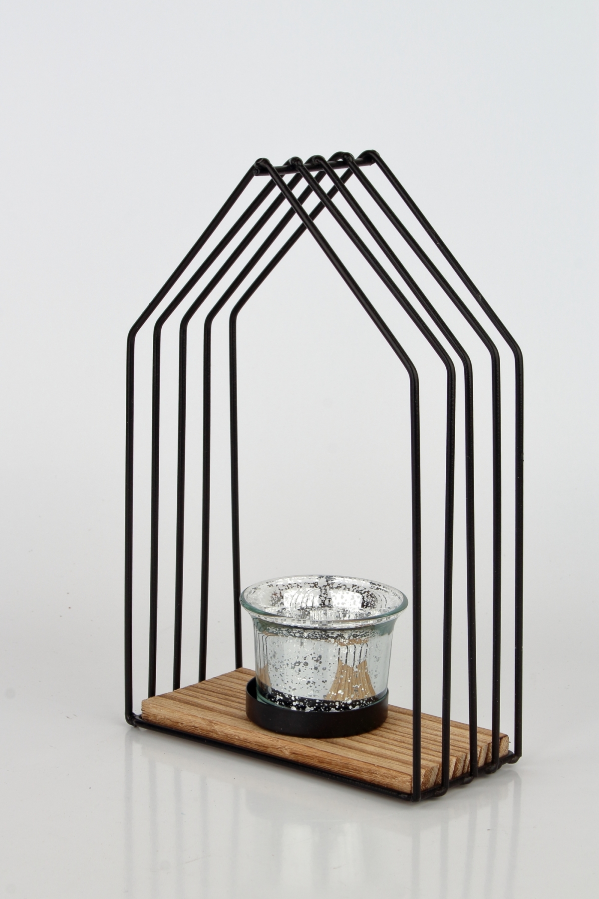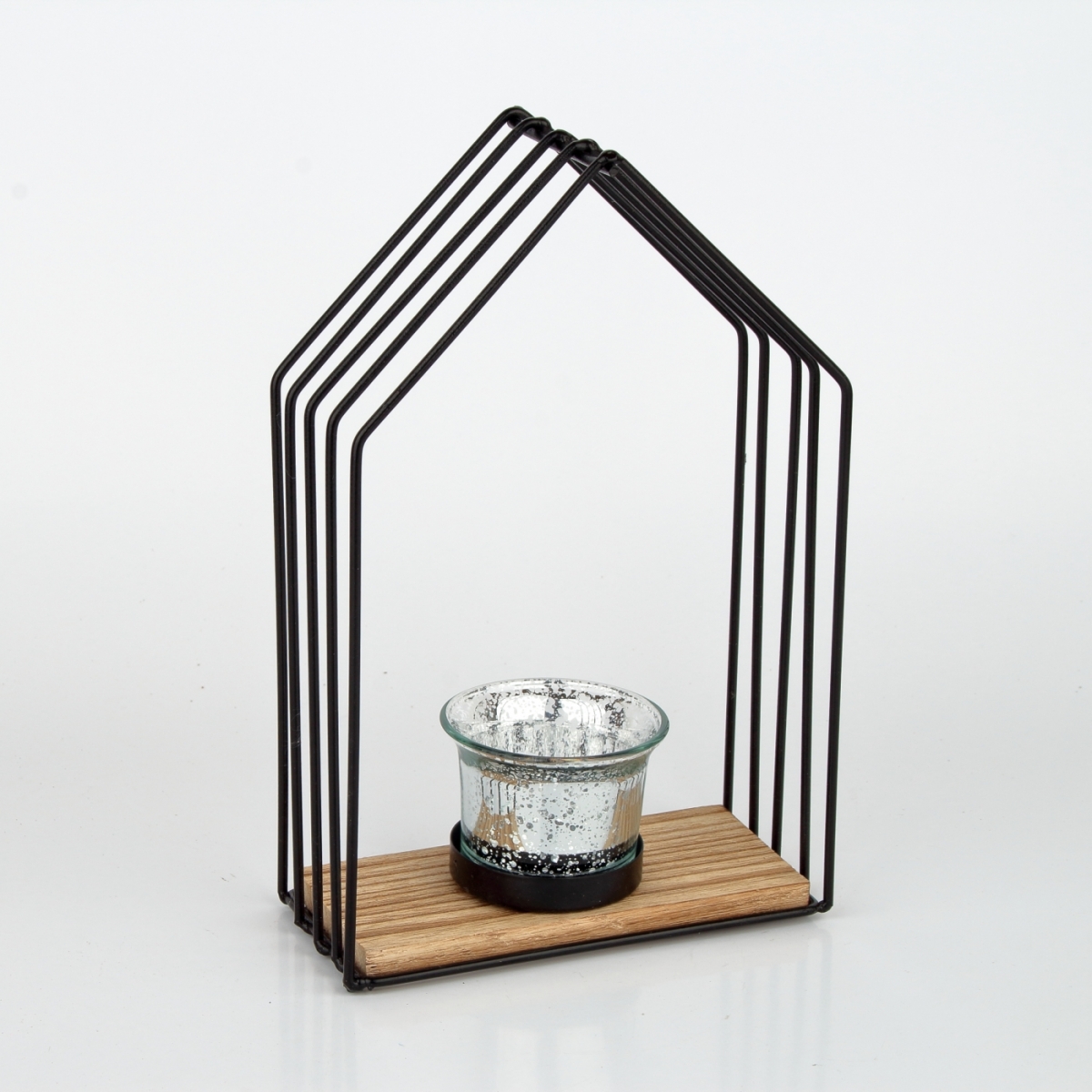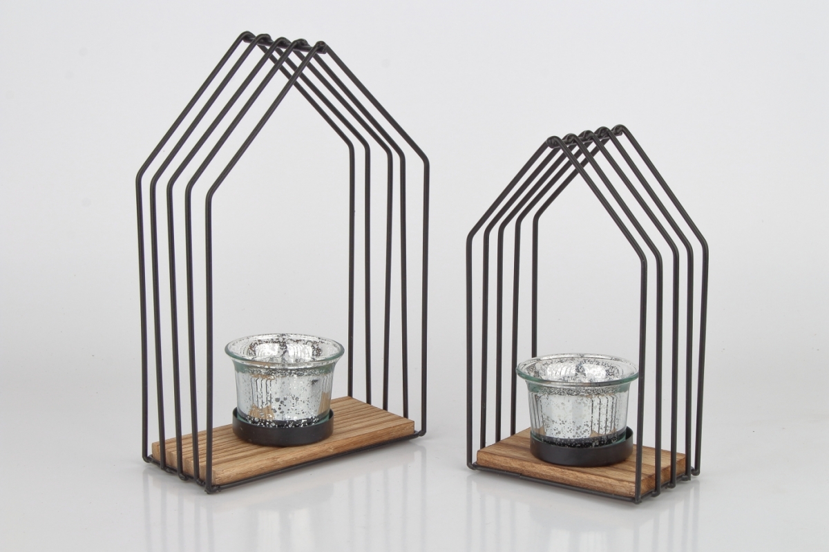 Kovový svietnik v tvare domčeka s drevenou plochou