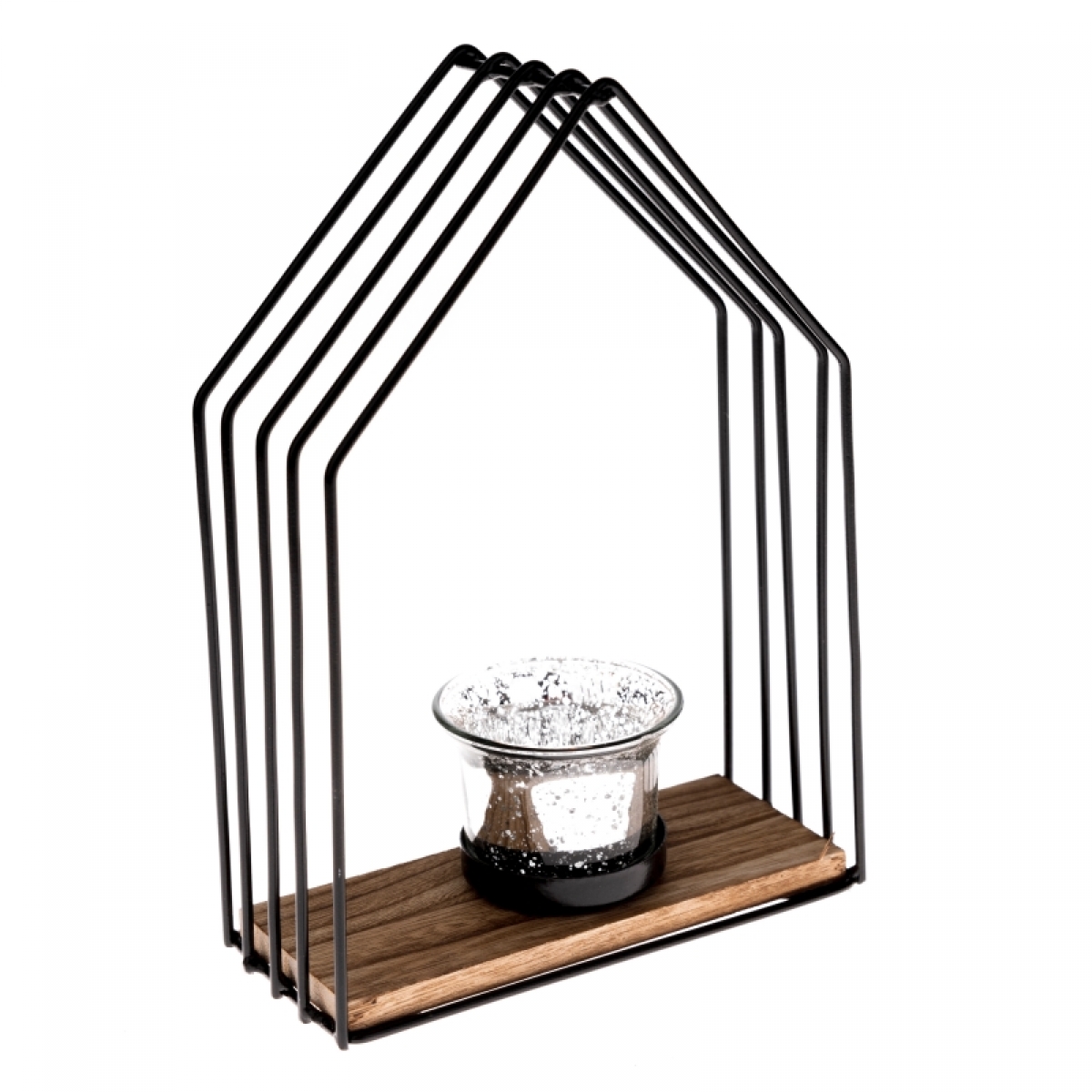 Kombinácia prírodného dreva a čiernych kovových prvkov je v poslednej dobe veľkým hitom, a to úplne oprávnene. Nábytok aj doplnky v tejto kombinácii sú krásne a štýlové, zrovna ako tento kovový svietnik v tvare striešky na čajovú sviečku.