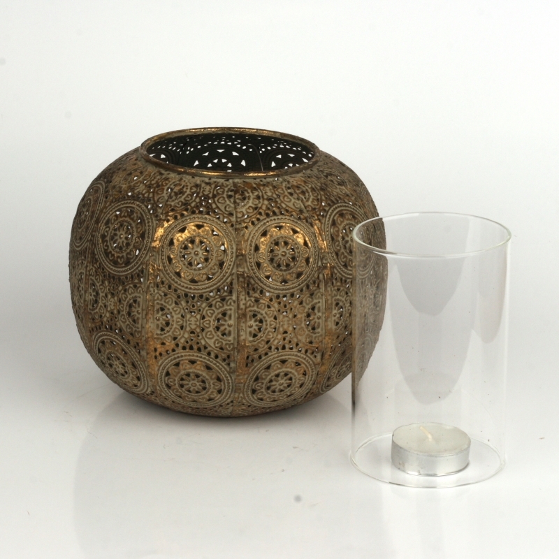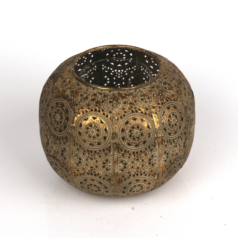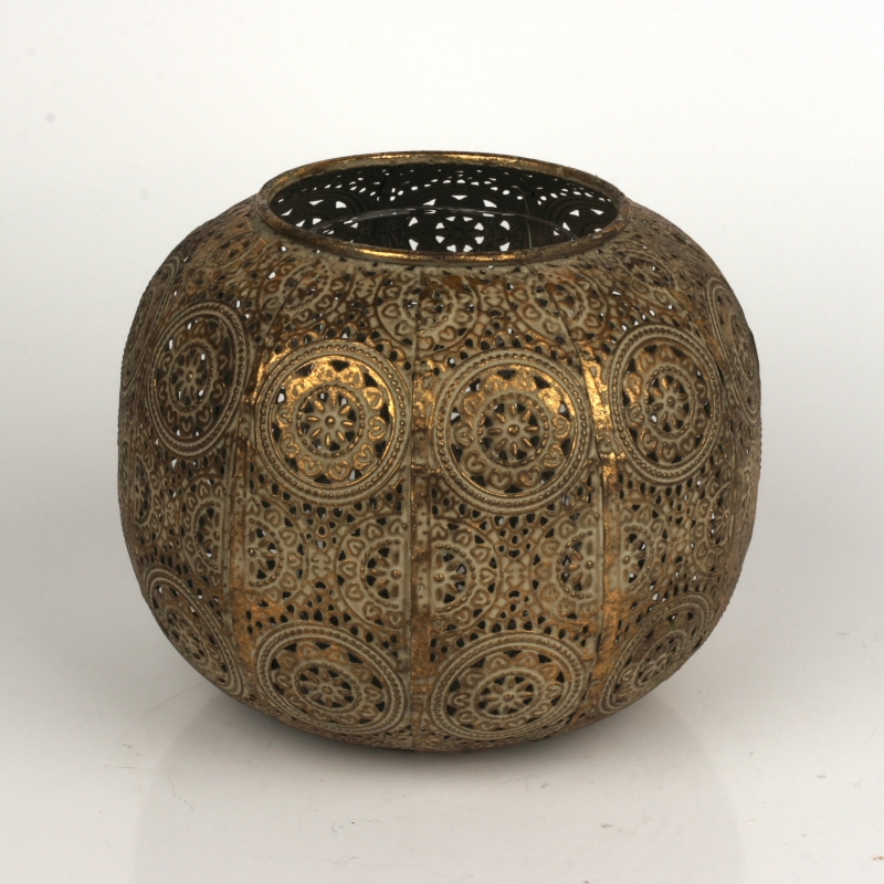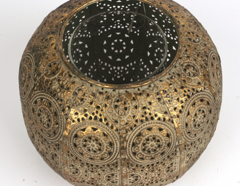 Kovový svietnik zlatá guľa 17cm má netypický čipkovaný vzhľad a na prvý pohľad na vás dýchne vôňou orientu.