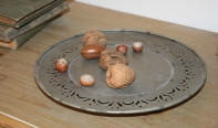Dekoratívne kovový tácka má na okrajoch krásne zdobenie. V rovnakom dizajne môžete zakúpiť a tanier vo väčšej veľkosti.