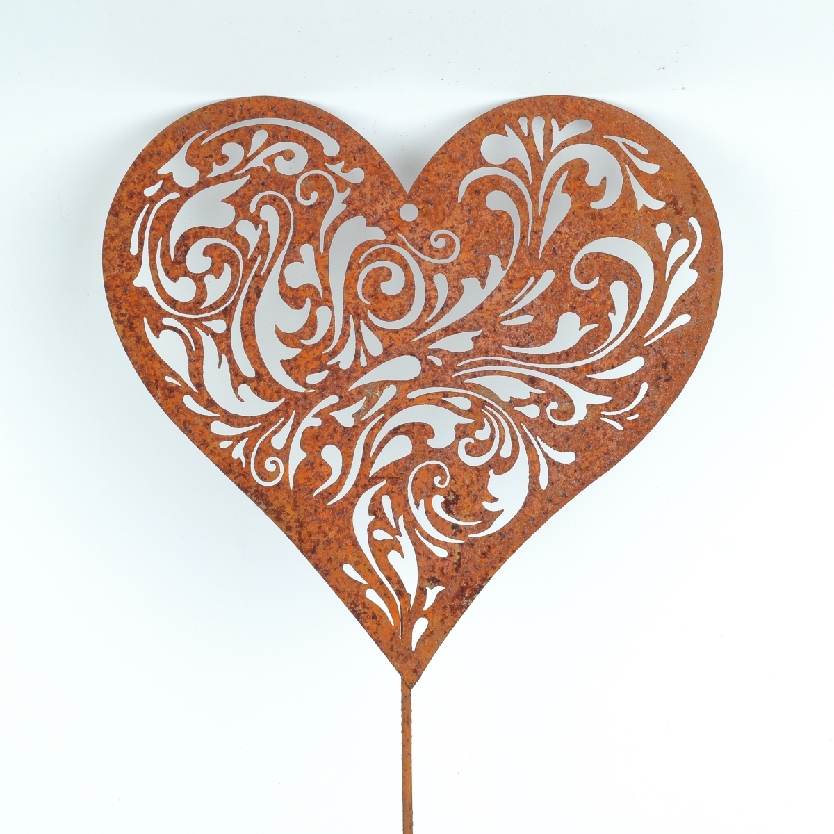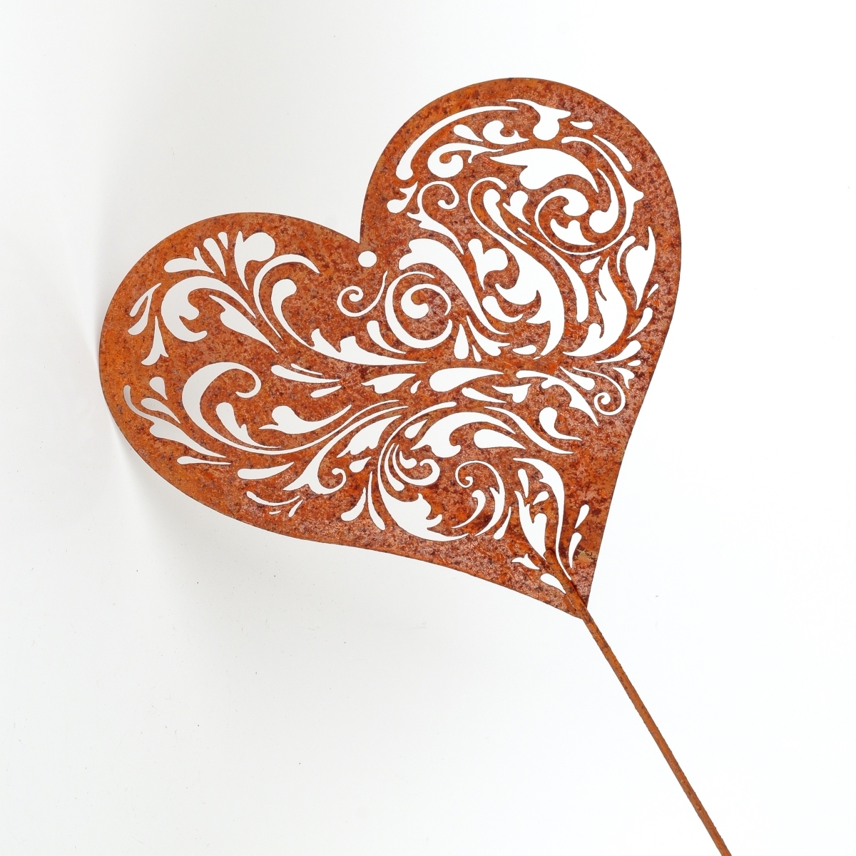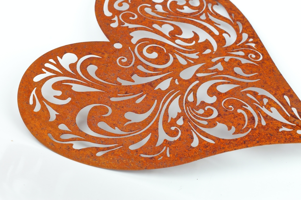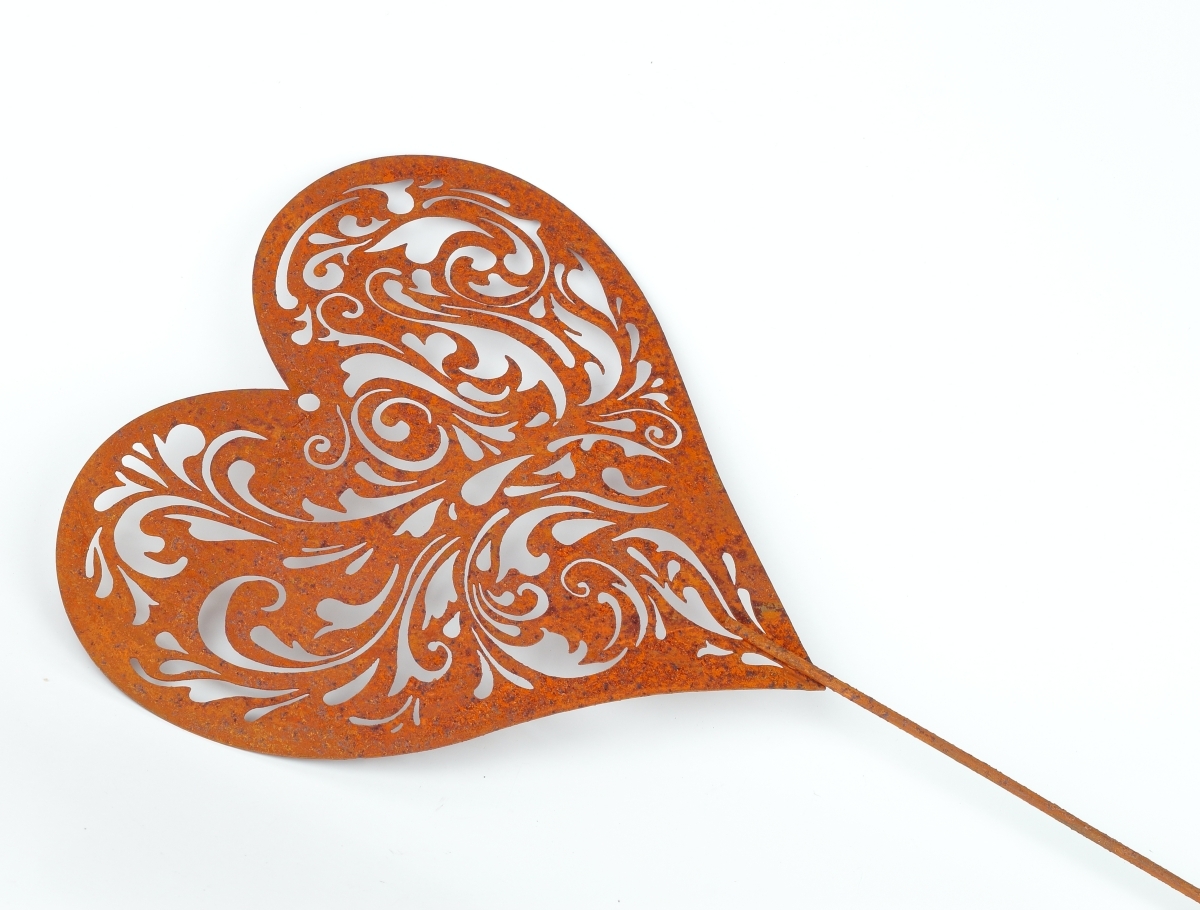 Kovový zápich do záhrady srdca z kovu s umelo vytvorenou dizajnovou hrdzou na povrchu. Telo srdca je perforované a môžu tak jeho povrchom prestupovať slnečné lúče. V trávniku alebo na posedení, sa vám tak budú zobrazovať neopakovateľné tiene prestupujúcich sa slnečných lúčov srdcom.