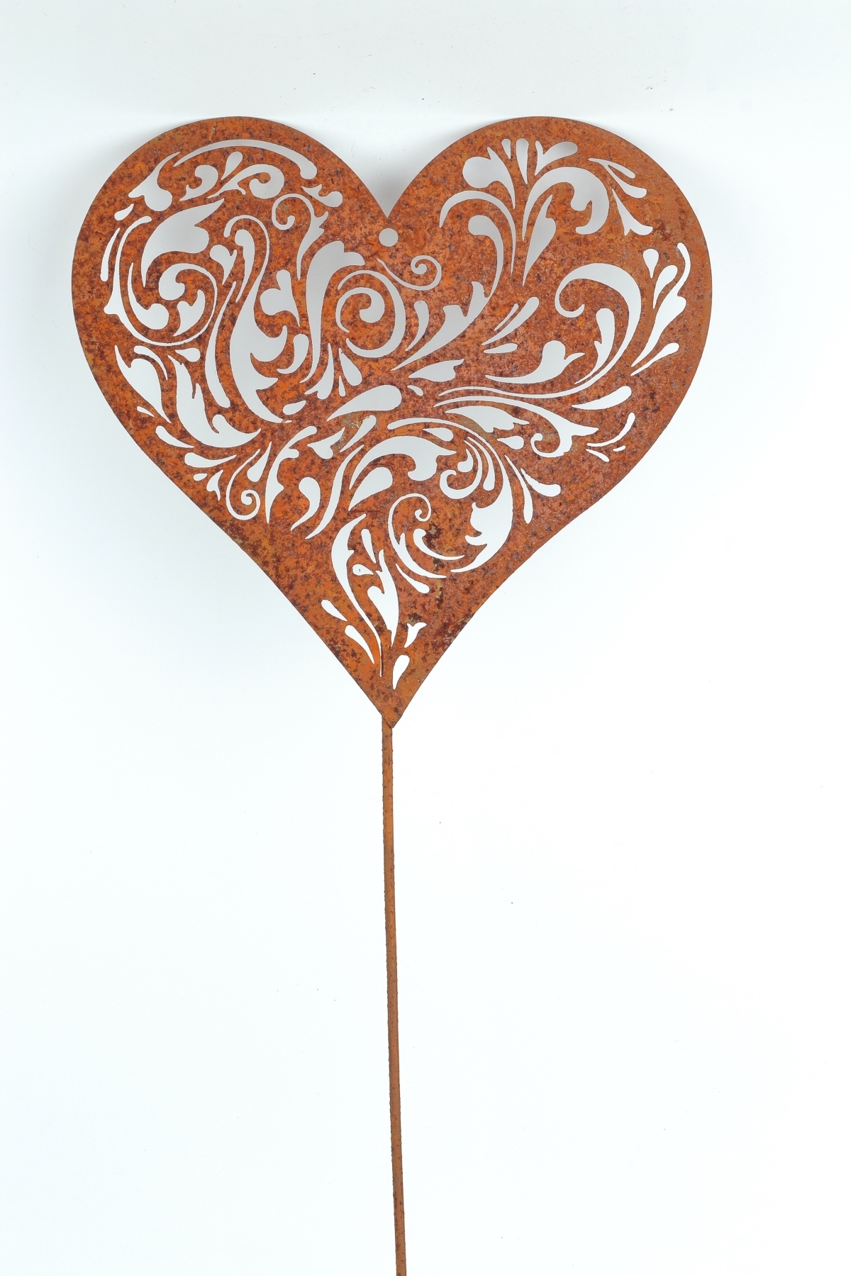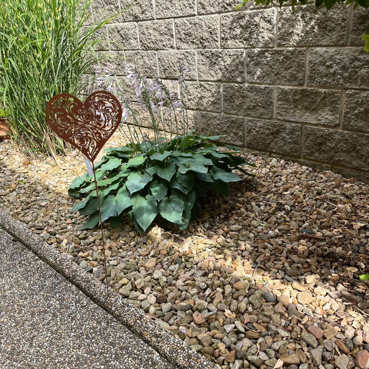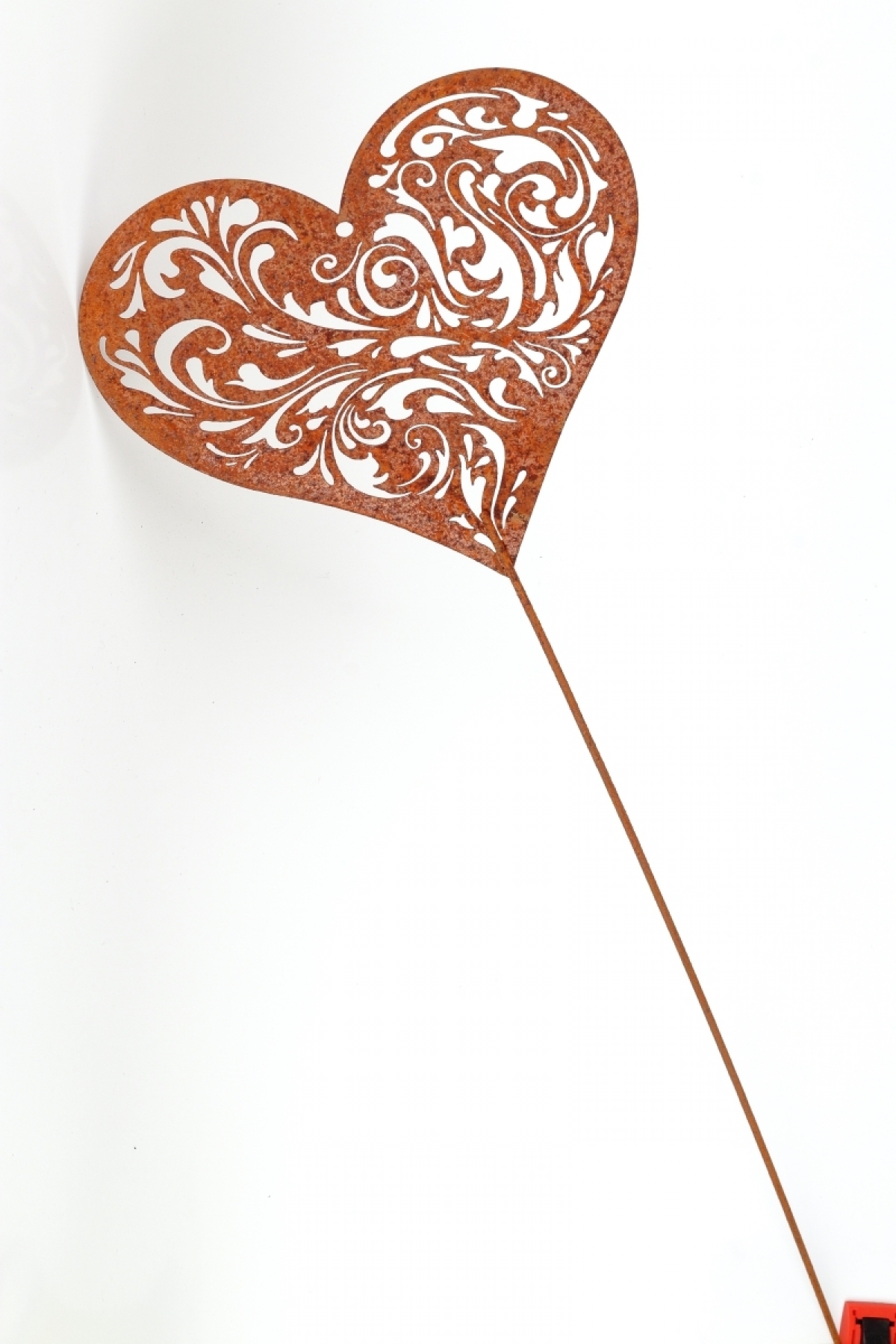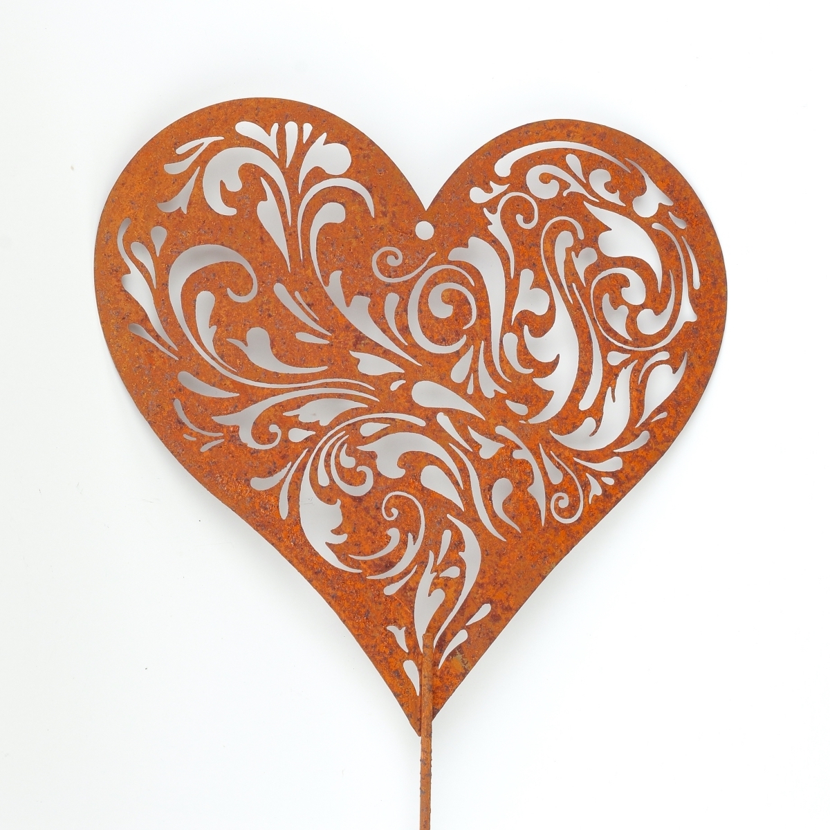 Kovový zápich do záhrady srdca z kovu s umelo vytvorenou dizajnovou hrdzou na povrchu. Telo srdca je perforované a môžu tak jeho povrchom prestupovať slnečné lúče. V trávniku alebo na posedení, sa vám tak budú zobrazovať neopakovateľné tiene prestupujúcich sa slnečných lúčov srdcom.