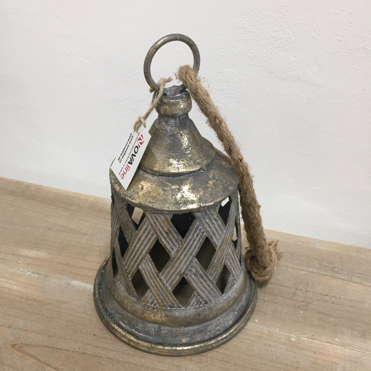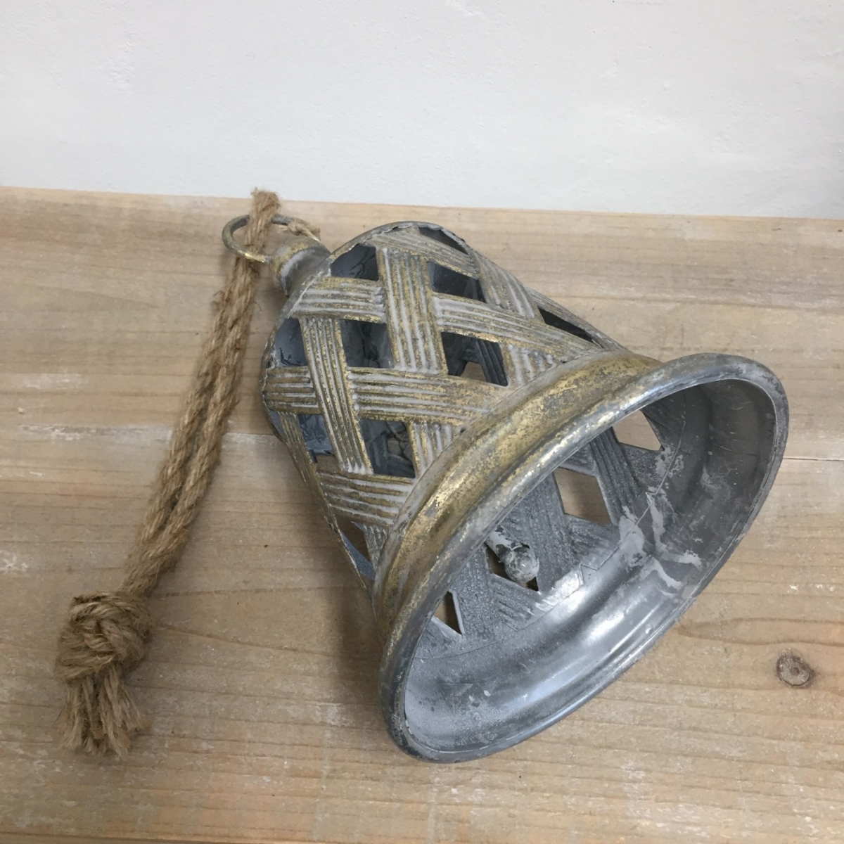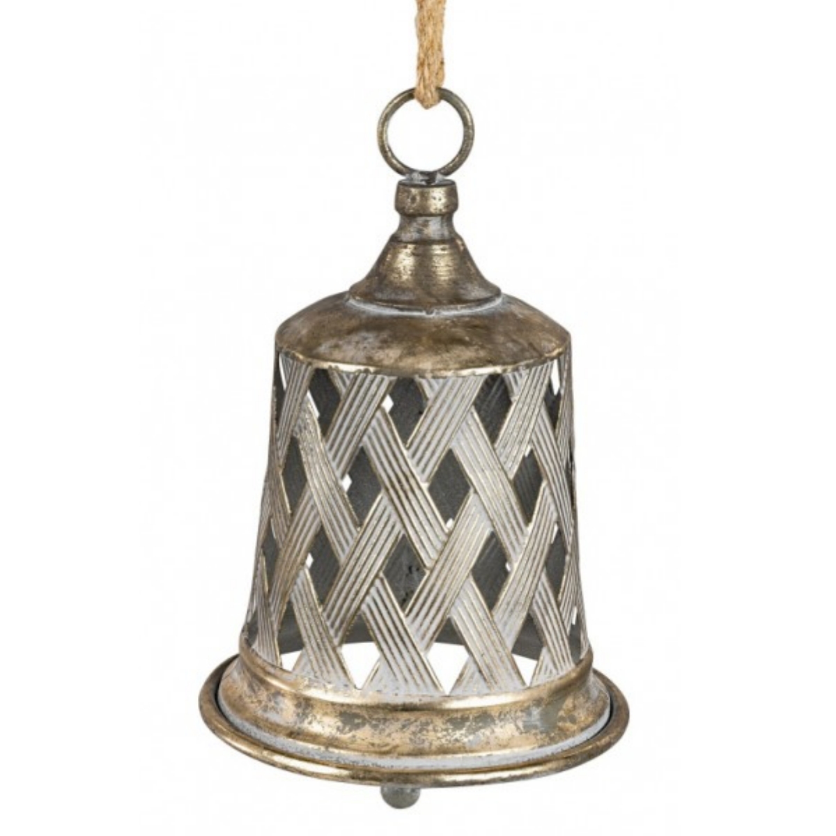 Kovový zvonček v tvare veľkého náprstku so zaujímavo prerezaným plášťom, ktorý robí z tejto závesnej dekorácie skutočný skvost. Patinovaný zlatý povrch navyše dodáva zvonu starožitný vzhľad.